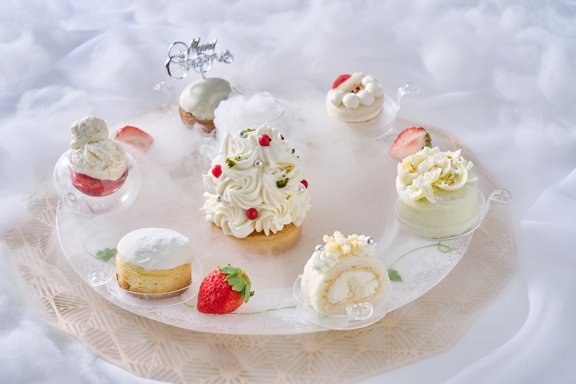 「クリスマスアフタヌーンティーセット」は、クリスマスをイメージしたスイーツ7種とセイボリー9品で構成され、まるで雪景色の中に迷い込んだかのような幻想的な世界がプレート上に広がります。中央にはクリスマスツリーをモチーフとしたアイスケーキを配置し、メレンゲでデコレーションしました。周囲には、ホワイトチョコケーキやロールケーキ、マカロン、苺をあしらったグラスデザートなどのスイーツを揃えました。さらに、スモークによる演出で視覚でも、心ときめくクリスマスの世界をお愉しみいただけます。