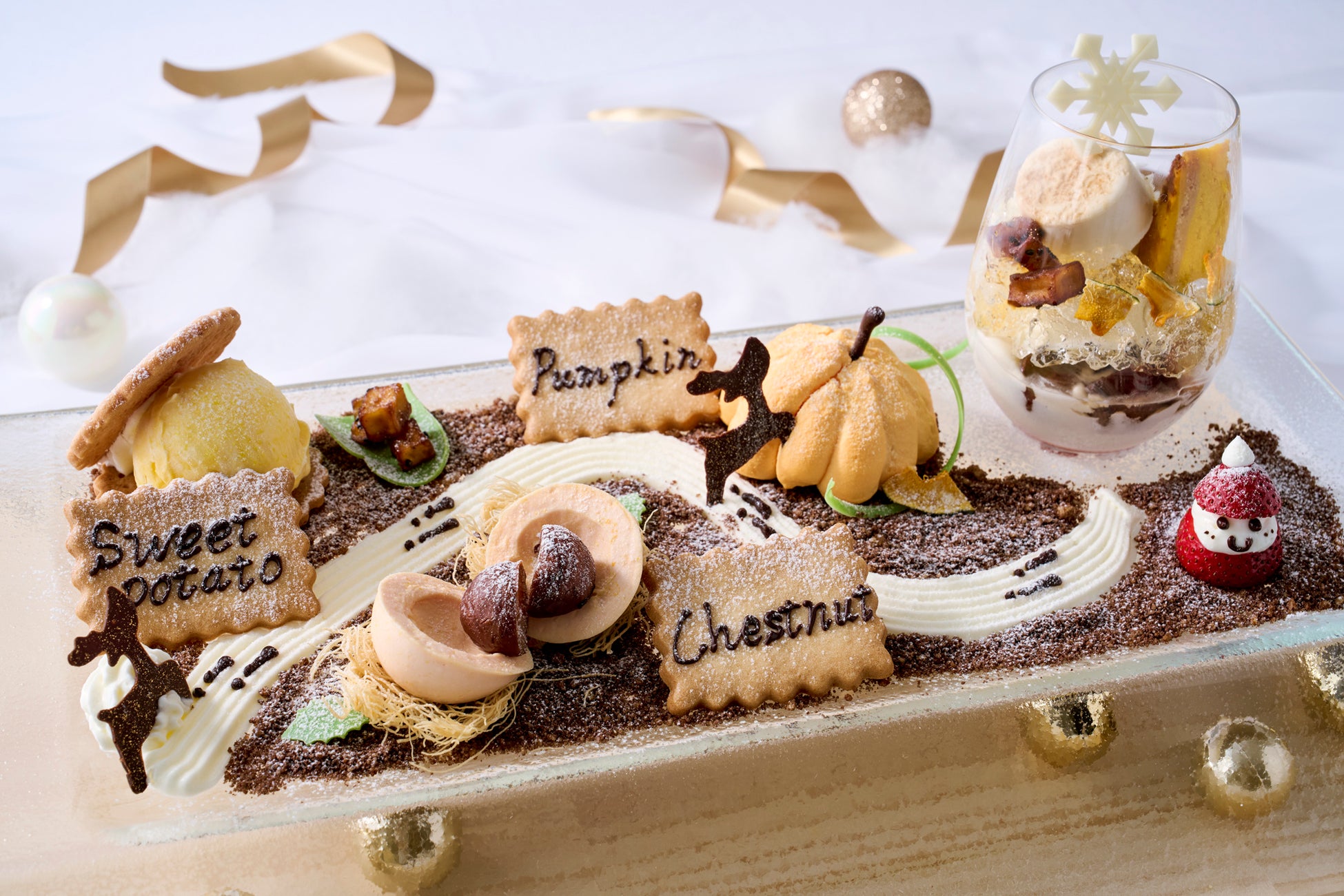 「サンタさんのお散歩道」は、雪が積もる冬の景色を表現し、冬の味覚を盛り込みました。愛らしい小さなサンタクロースとグラスに詰め込んだパフェが、クリスマスのワクワク感を引き立てます。芋・栗・南瓜の自然の恵みと遊び心を詰め込んだ一皿になっております。