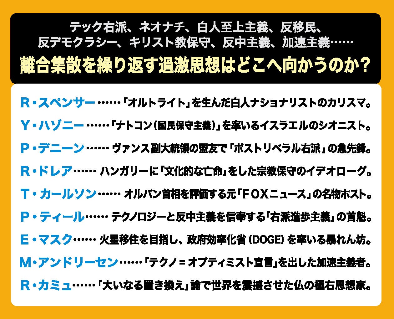 トランプ政権による国家改造の成否に関わらず、リベラル・デモクラシーへの不信感は決定的なものとなっている。左右両極の間で起きた思想戦争の内幕を追いながら、テック右派から宗教保守、ネオナチなどの思想家たちが、なぜリベラルな価値観を批判し、社会をどのように作り変えようとしているのか、冷静な筆致で読み解く。