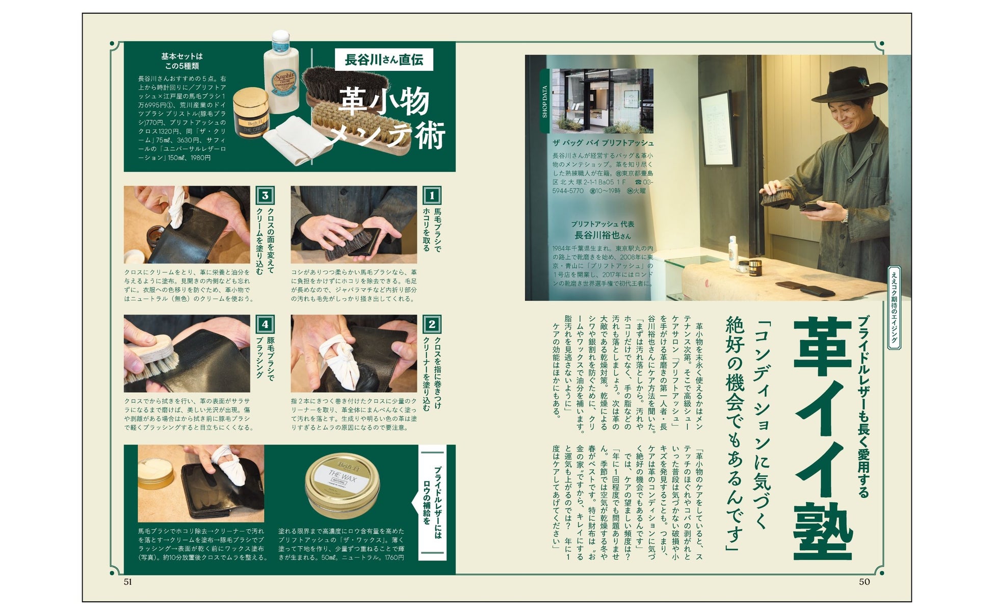 「黒のストレートチップ」をおさらいしつつ、洒落者が愛する名靴を知る靴企画、革小物を美しくエイジングさせるテクニック紹介ページも読みごたえあります。
