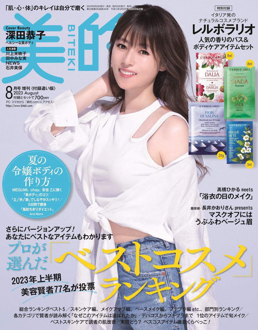 すらりと伸びた脚、キュッと引き締まったウエスト。女性らしい丸みを残しつつ、締まるところは締まった「憧れボディ」を持つ深田さんが、『美的』8月号の通常版&付録違い版表紙2パターンを飾ってくれました。