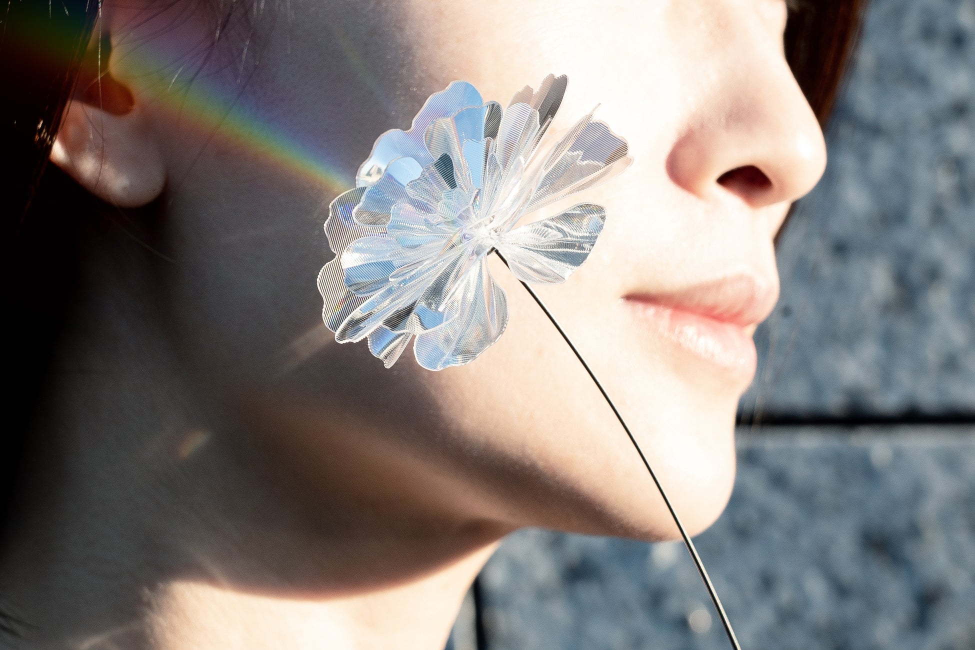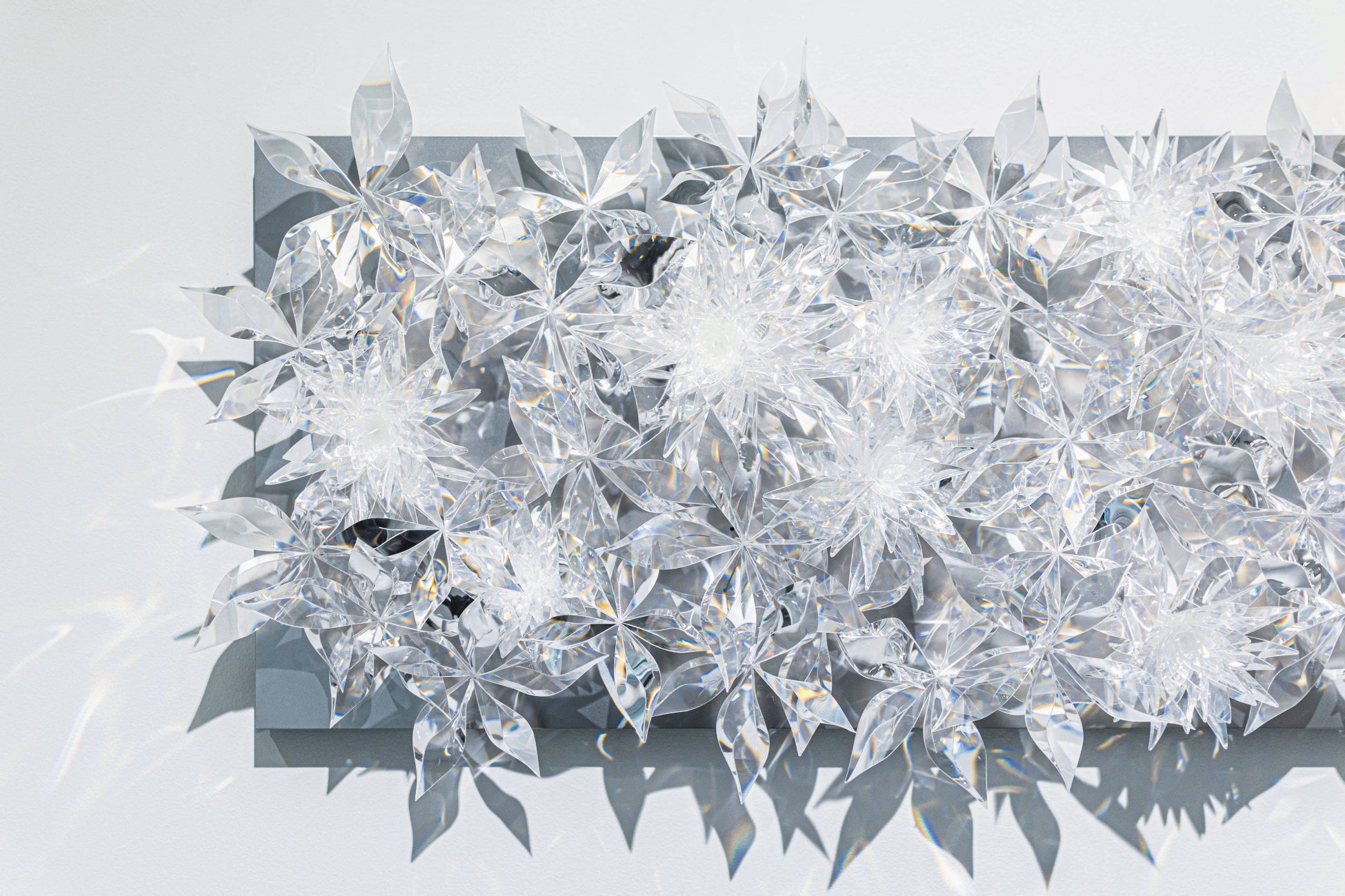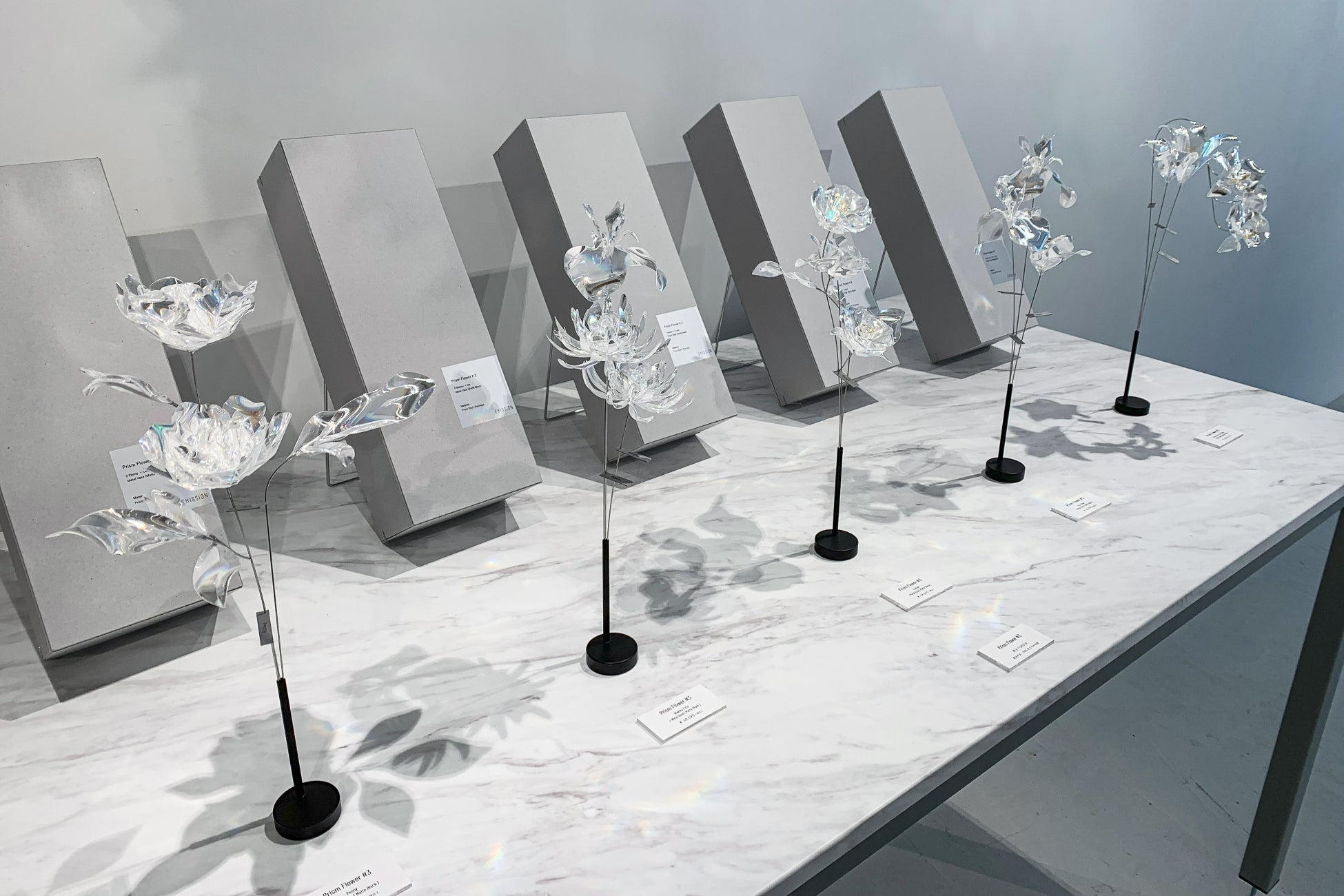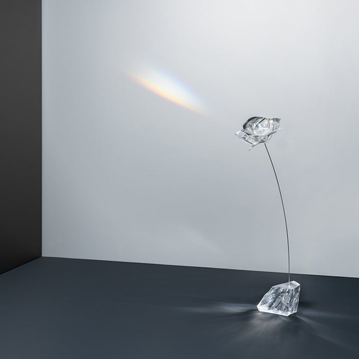 光学ポリカーボネートの透明な質感と構造によって、プリズムの光を生み出す「EMISSION(エミッション)」独自の素材であるプリズムレイを使用し、花の美しさを結晶化したアートオブジェ。
