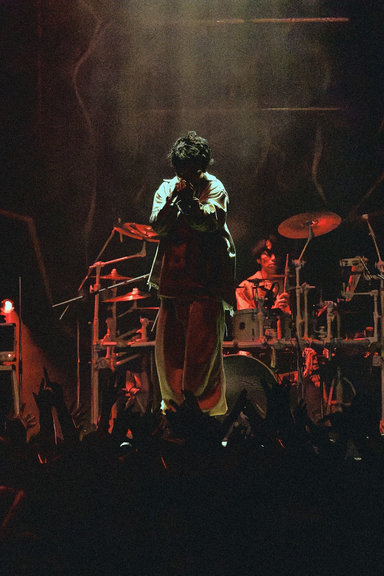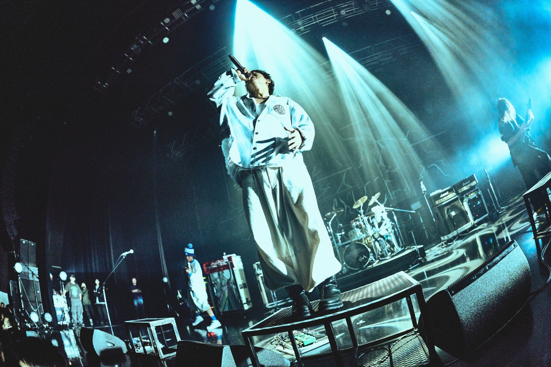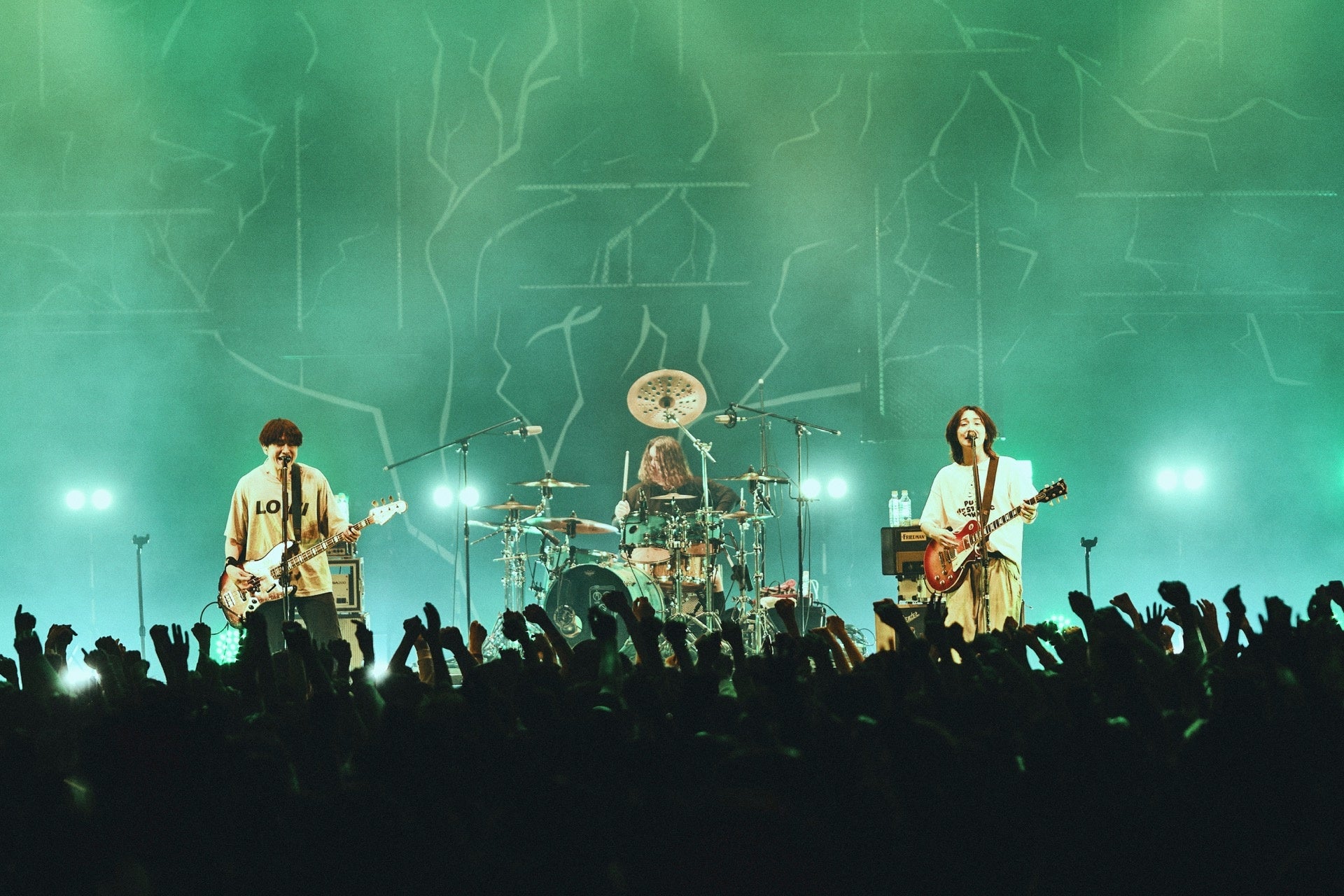 実際、My Hair is Badの椎木がステージで発した「人を傷つけてばかりだった俺が、ちょっとずつ大人になって。人を変えられるなんて思い上がり、だけど自分は変えられるんじゃないかなって」「足るを知るってこと。本当はもう、大事なものは自分の心の中にあるんだよ」という言葉達はマイヘアにとっての円熟と新しい衝動の在処を表していた。あの頃と変わらず蒼い疾走感を放つ“アフターアワー”、それに対して、時が経つほどに「痛い思い出」が温かな人生の跡として響くようになってきた“真赤”、緩やかなリズムに身を委ねながら今あるものを丸っと受け入れていく生活の歌“ここで暮らしてるよ”などを筆頭に、時を重ねる度に変化したり深化したりする音楽の不思議さと、あくまで人間表現だからこその極端な振り幅が終始鳴り続けていた。“フロムナウオン”の途中で椎木が叫んだ「キモくなろうぜ! その歪さがAIをも超える! キモさで空を飛ぶ!」という言葉は、バンドがライヴに明け暮れ、人々がライヴに集ってぶつかり合う理由をズバリと言い表していた。悲喜こもごも、愛憎、生きたいと死にたい、希望と絶望。その全部を矛盾ではなく自分自身の輪郭にするために人々は歌を歌い、叫ぶのだ。