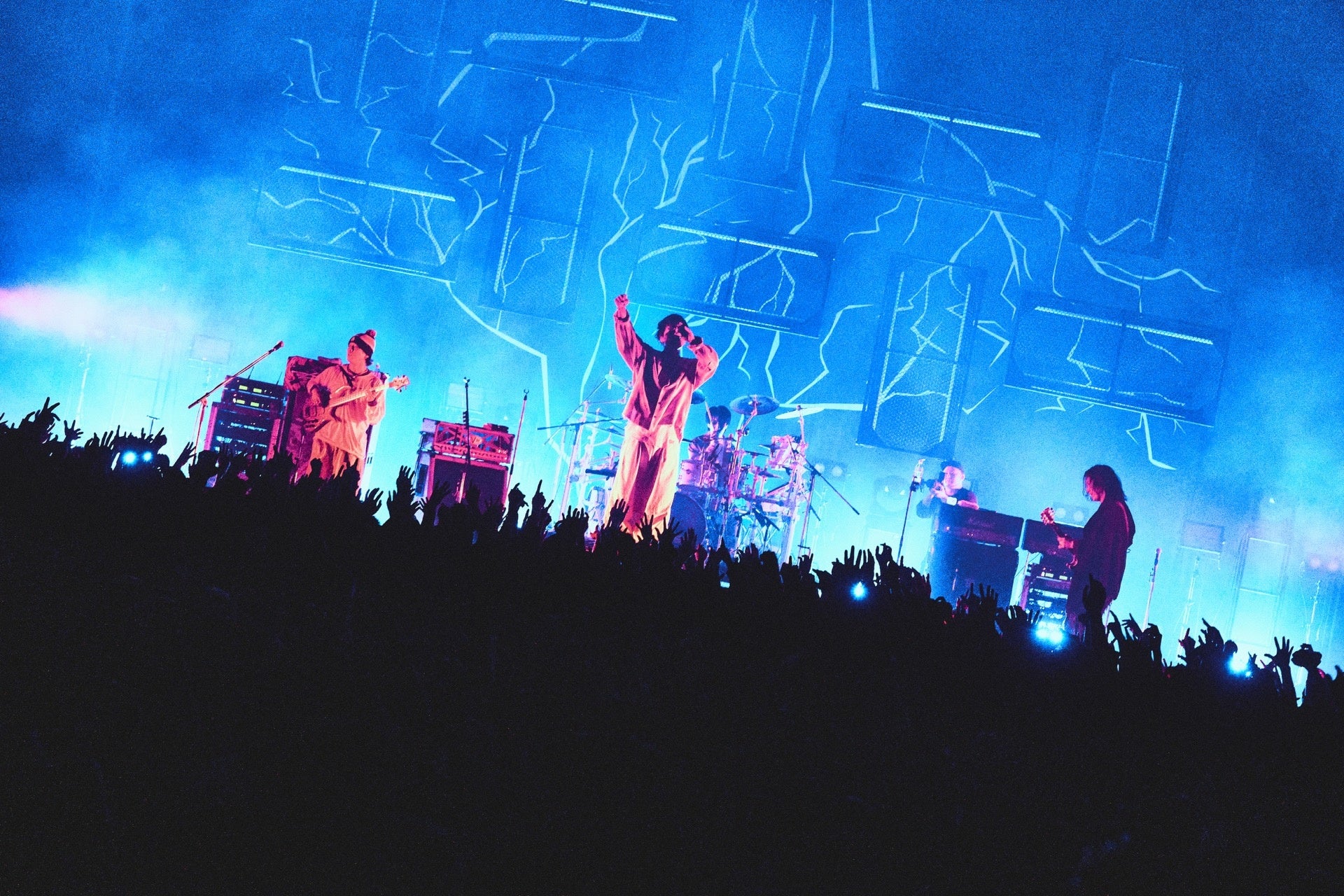 そしてTHE ORAL CIGARETTESのライヴは、ひたすらアッパーに上げ続ける獰猛なセットリスト。「SNSとかで(前日までの)セットリストがバレてるかもしれないですけど、間のちょっと落ち着くところは全部削ったんで。全部上げていきます!」というMCの通り、しっとりとした楽曲は一切なく、跳んで叫んで拳を掲げるためだけと言ってもいい全12曲だった。オープニングは最初期の楽曲“mist…”。今となっては「ライヴの場では、何も我慢する必要はない」というメッセージに聴こえてくるから不思議である。これもまた、歌う人間・鳴らす人間によって歌が形を変えていくことを表している。感情の扉をこじ開けろ。そんなふうに語りかけるオープニングだった。さらに“嫌い”、“Mr.ファントム”と続け、ここには、デビュー当時の楽曲がいかに変化したのかを提示する意図も込められていたはずだ。実際“Mr.ファントム”はリリース当時に聴こえていた跳ねた感覚よりも、つんのめる寸前のスピードで前に突進していくような推進力を感じさせるものになっていた。音の一つひとつが粒立って耳に飛び込んでくる抜群の音響も、楽曲の土台というよりも曲をプッシュして押し出していく役割を担っているリズム隊の妙技も、成熟の向こう側の新しい衝動というか、技術をベースにしたフレッシュさを楽曲に宿している。こうして曲の歴史を再訪するセットリストも、上述したオーラルの現在の活動スタンスに直結するものだろう。自分達の歴史をファンと共有し、変化を認め、進化を面白がり、それによって自分達の歩んできた道をさらに未来へと繋げていく。自分達の場所を自分達自身で豊かにしていくバンド活動。その想いは、コロナ禍以降に山中が一貫して語り続けてきたことだ。それをまさに体現せんとする今のオーラルであり、ライヴである。
