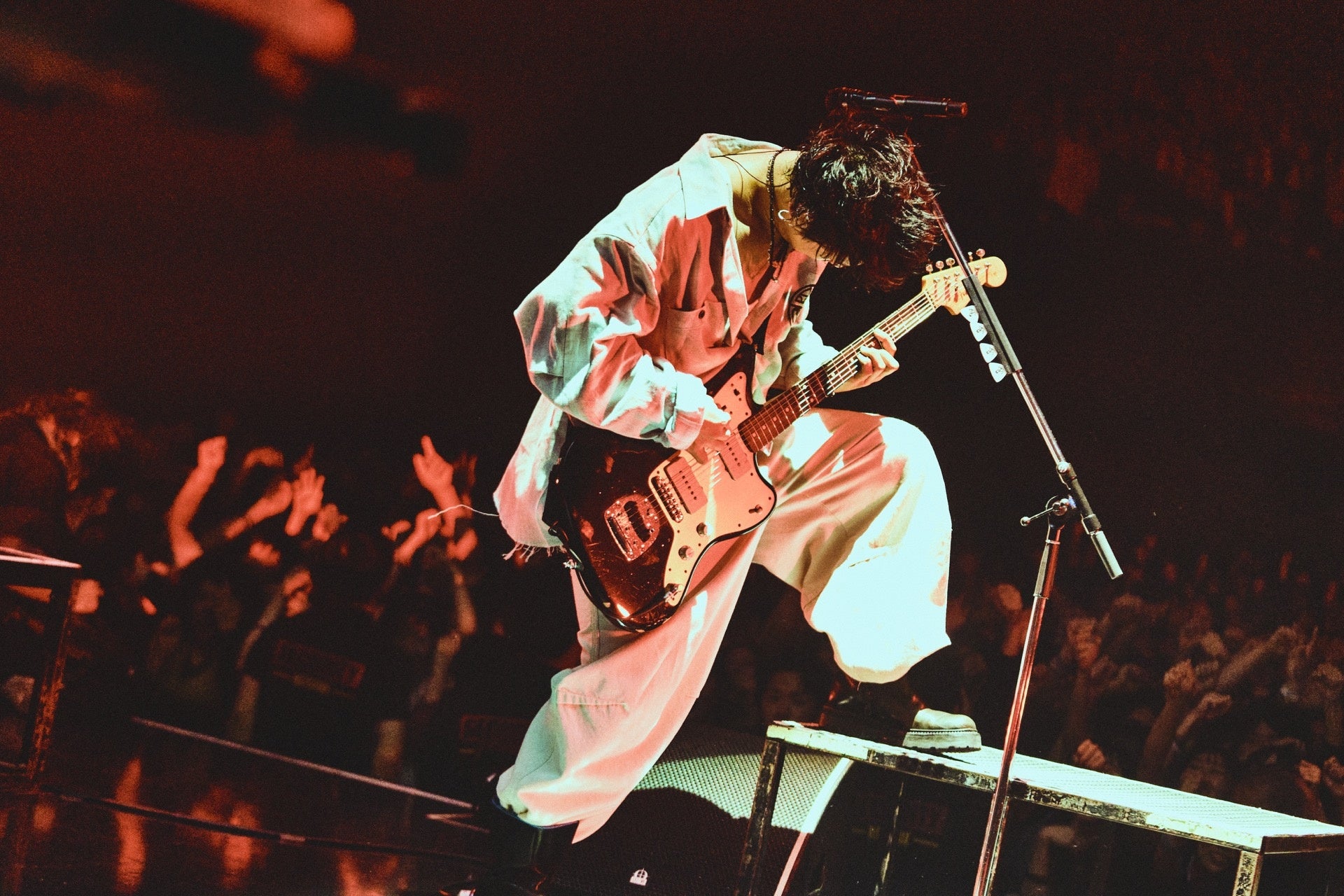 「10年前くらいかな、どっかのフリーマーケットで買ったデニムがあって。でもひとつだけ買うのを躊躇したポイントがあって、腰のところに変な刺繍が入ってたんです。だけど色褪せ具合とかが気に入ったから、買ったんですよ。で、そのデニムを10年間履き続けてきたんですけど、この前それを履いて歩いてたら、前からめちゃくちゃコワモテのおじさんが俺のほうに歩いてきて。『そのデニム、どこのや? ちょっと後ろ向いてくれ』って言うんですよ。それで後ろ向いてデニムを見せたら、『それ俺のや』って言われて(笑)。そんなことある!?っていう話ですけど、生きていたらそういう奇跡的な出会いがあるし、時間が経てば経つほど出会いの熱量って上がっていく気がするんです。My Hair is Badと俺らも、出会って10年が経ちました。椎木が悩んでいる時も話を聞いてました。でも、この10年で今日のマイヘアが一番カッコよかった。10年間、出会いを温めてくれてありがとう。……音楽っていうものは、同じ曲だとしても、同じ人が歌っていても、歳を重ねた時に変わって聴こえることがある。変わらないことが正義じゃなくて、変わった上で変わらない芯があることやったり、その芯が見えたりする瞬間こそが美しいと思います。だから音楽というのは、『その時だけ好き』みたいな流行りものとしてポイされるものじゃないんです。TilTokのバズとか何でもええけど、そんなもんはすぐポイされる。そんなん、面白くないで。10年経った後に青春を思い出せる曲もええし、その人が10年後も歌っている姿を観て『この人の生き様カッコええな』と思うのもええ。それこそが音楽の素晴らしさだと思う。誰かがいいと言ってるからとか、流行ってるからとか、そういうことじゃなくて、あなたが好きになってあなたが嫌いになったものを大切にしたらいい。もし多数派に囲まれて自信がなくなった時でも大丈夫。そういうお前らの邪念を俺らが消し去ります」