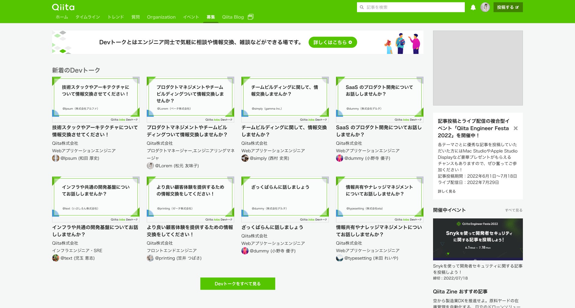 ・「Qiita Jobs」が提供している、エンジニア同士で誰でも気軽に話せる機能「Devトーク」に関する情報を閲覧できます。