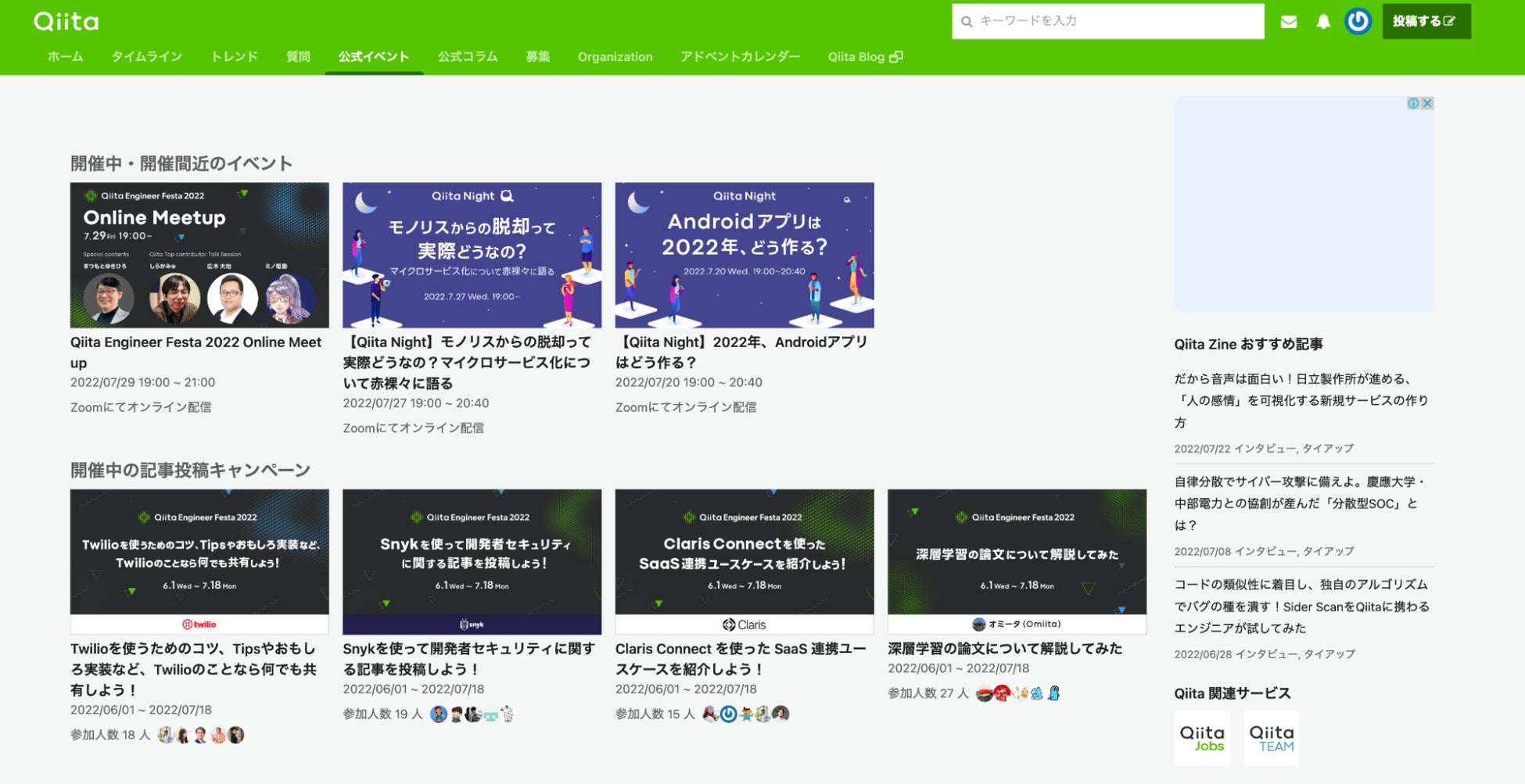 ・Qiitaが開催しているイベントや、特定のテーマで記事投稿を募集する記事投稿キャンペーンを閲覧できます。