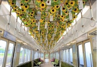 車内の天井には、お子様に描いていただいた風鈴のほかに、ひまわりの花を飾り夏の華やかさを添えます。皆さまのご乗車をお待ちしています。