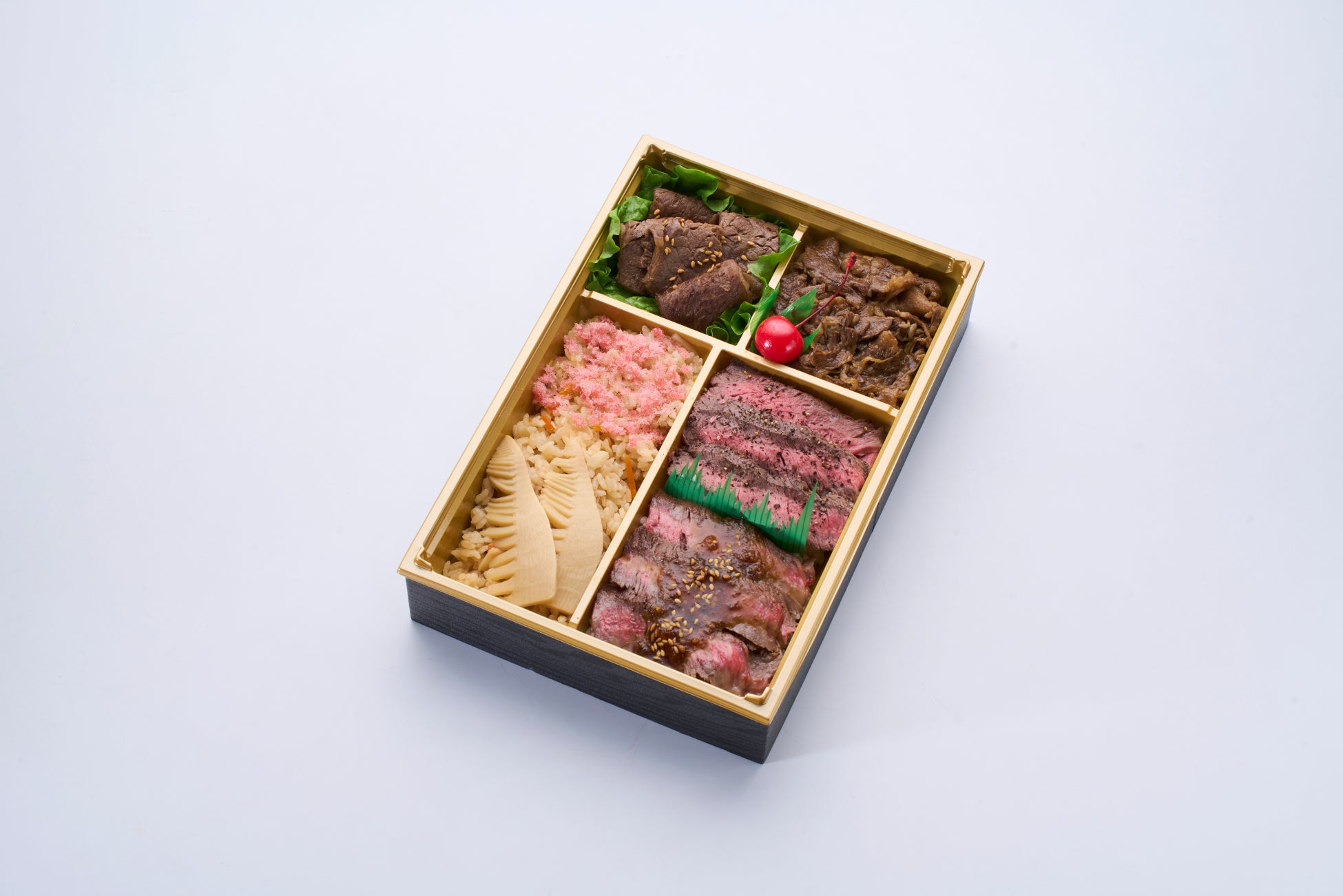 すべて米沢牛でステーキ(ガーリックオニオン・黒胡椒)、焼肉、すき焼を乗せた豪華なお弁当。