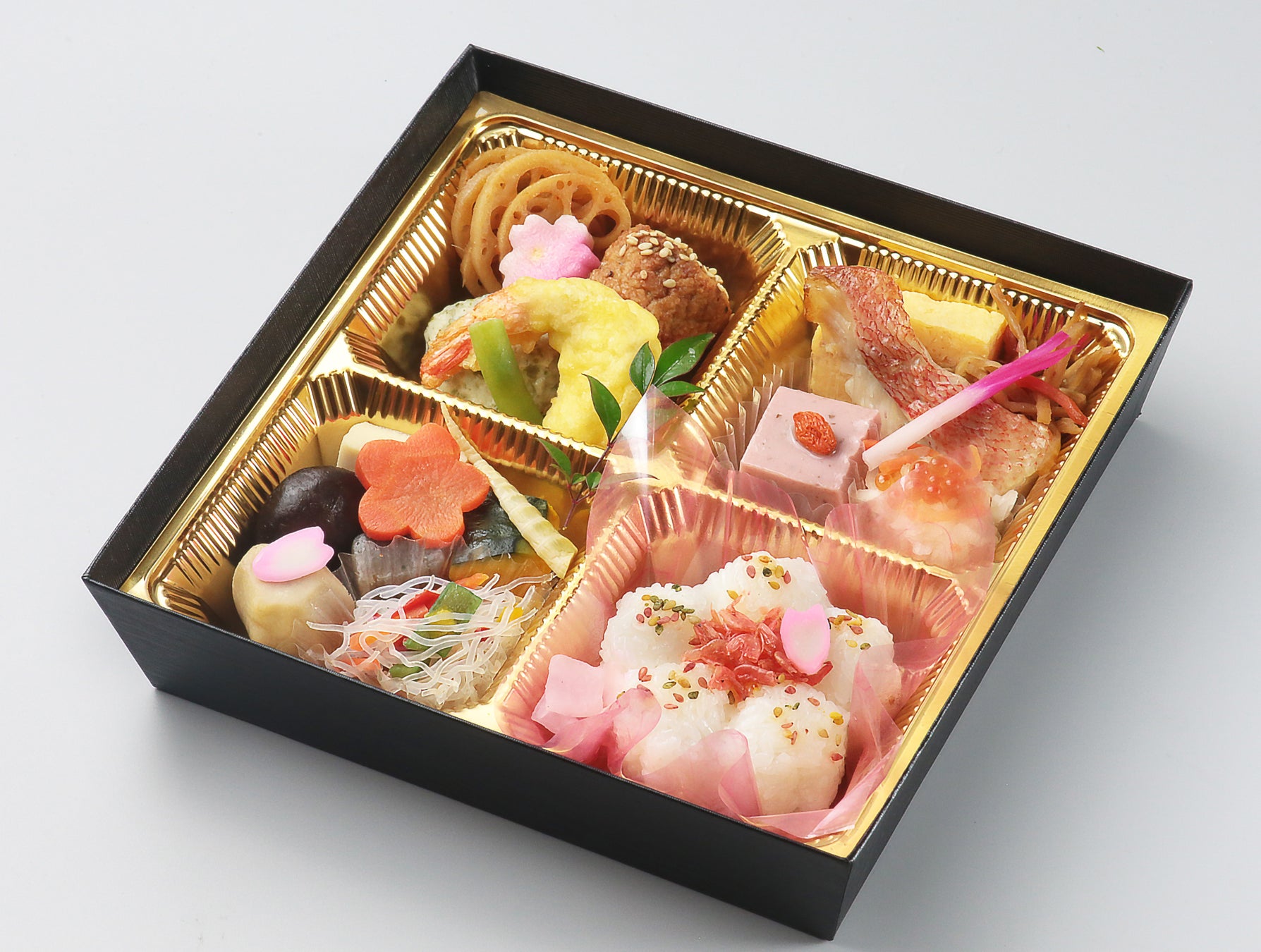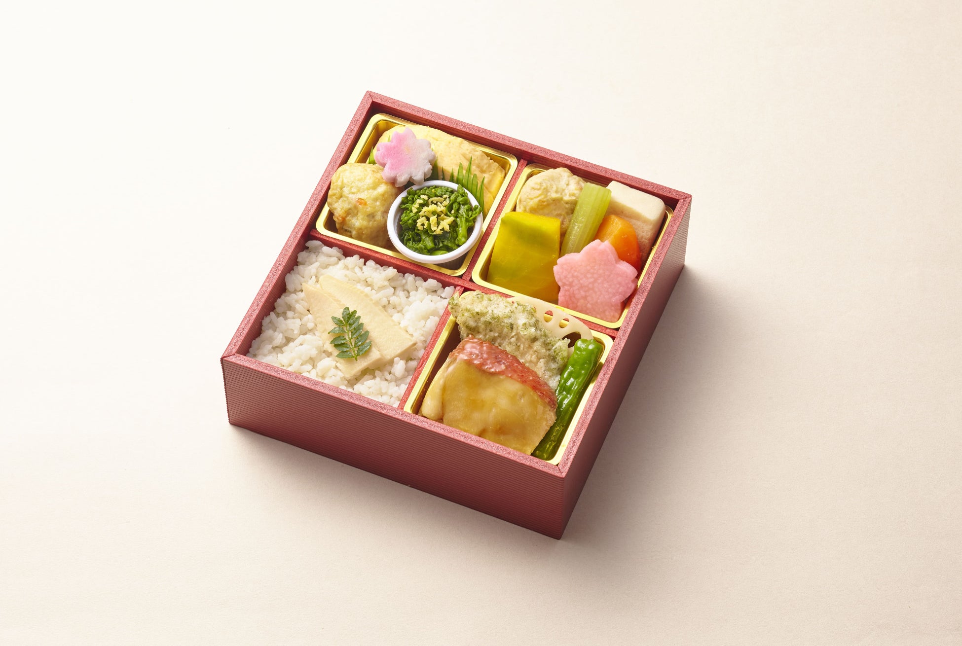 アブラガレイ味噌焼きやチキンと野菜の黒酢和え、豆腐ハンバーグなど人気のおかずを少しずつお楽しみいただける春の宴席にぴったりなにぎやかなお弁当です。