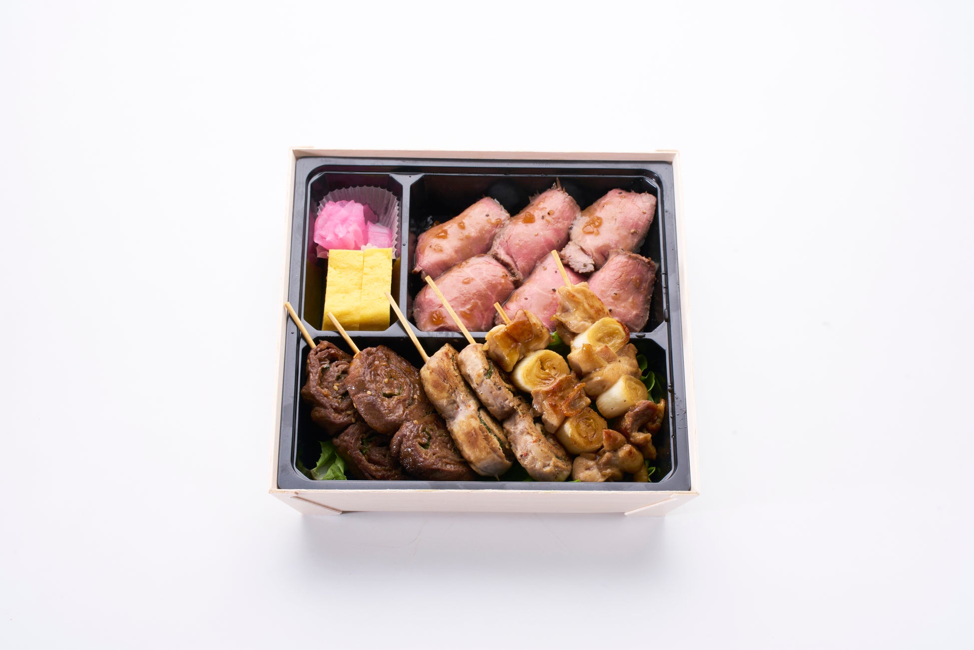 〈日山〉お花見肉三昧弁当 3,240円(牛・豚・鶏肉の串各2本、ローストビーフ寿司6貫)