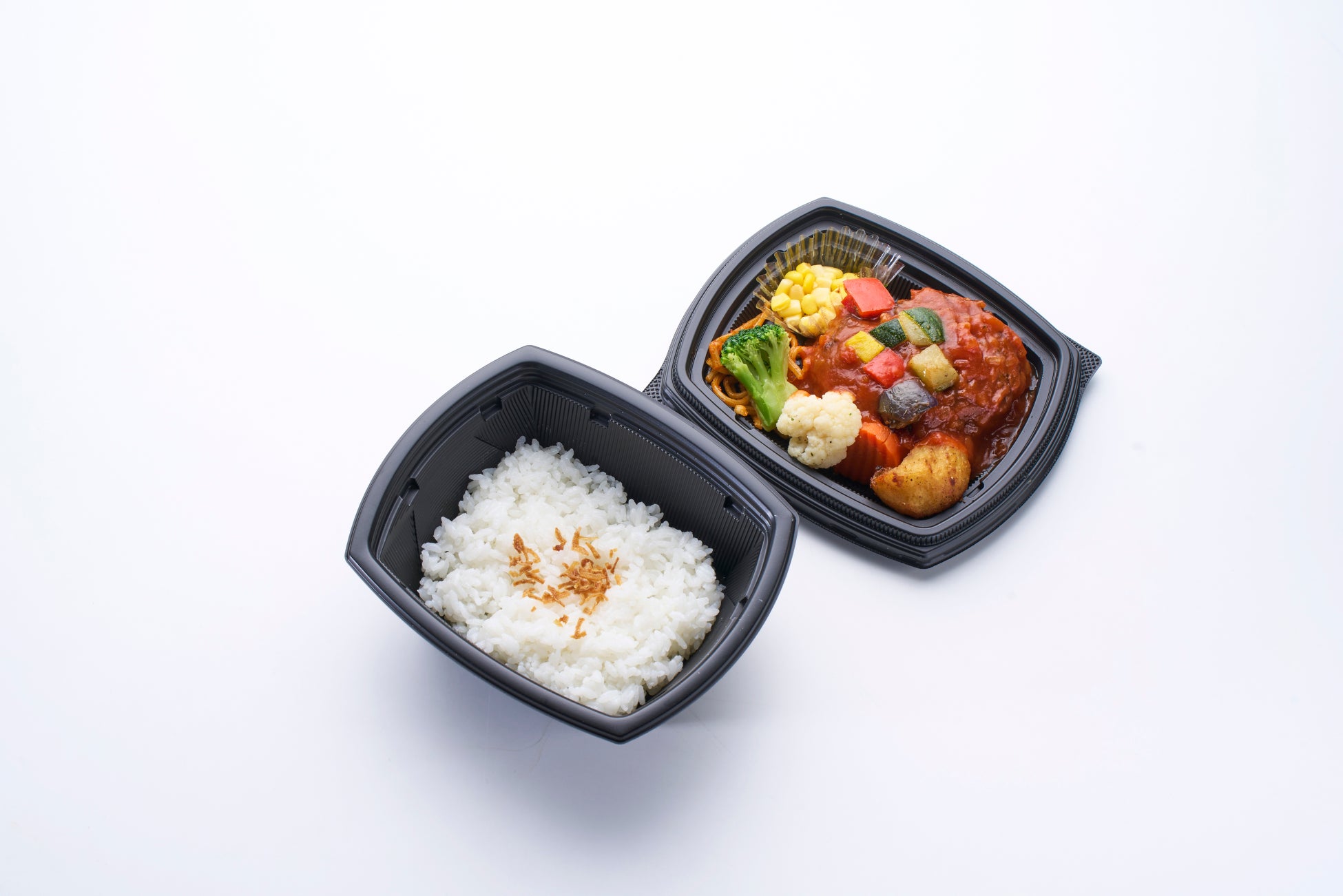 トマトソースに彩り野菜を添えたハンバーグのお弁当です。