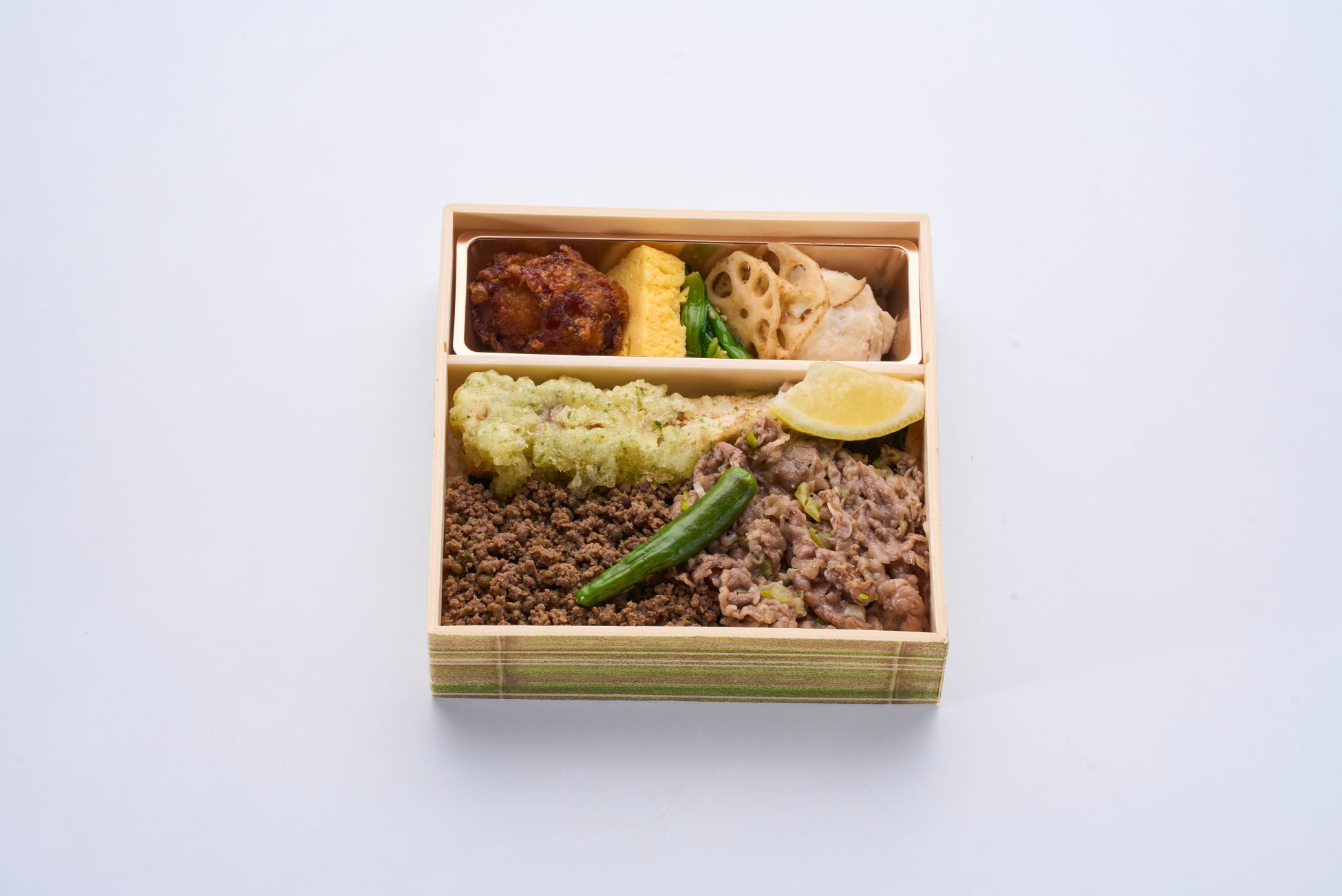 黒毛和牛をあっさりとした葱塩焼きにしました。山椒のアクセントでお肉の美味しさを最後まで楽しめるお弁当です。
