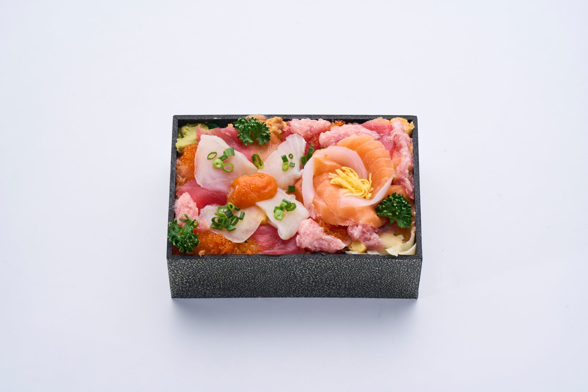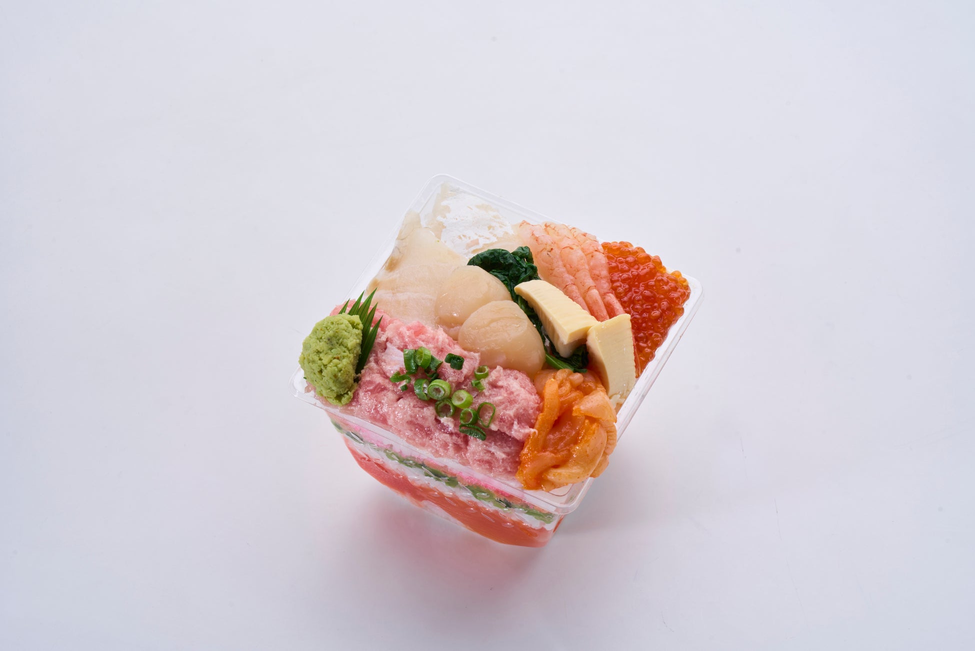 メディア放映多数の春の薄紅色の美しいミルフィーユ。昆布〆鯛、甘えび、いくら、ネギトロ、ホタテ、いか明太、菜の花など14種類の具材を詰め込んだ彩り美しさ満開のミルフィーユ。