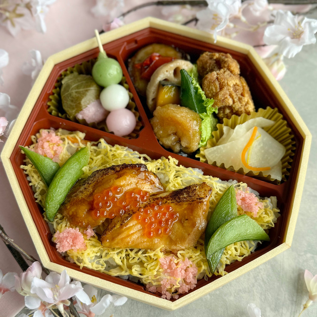 煮物、焼物、揚げ物が充実の「黒門」の春バージョン!赤魚柚庵焼、海老天麩羅、自慢の煮物と桜胡麻豆腐、桜麩、花弁餅など春を感じる食材を盛り込んだお弁当です。桜を模したご飯は小海老をのせて。