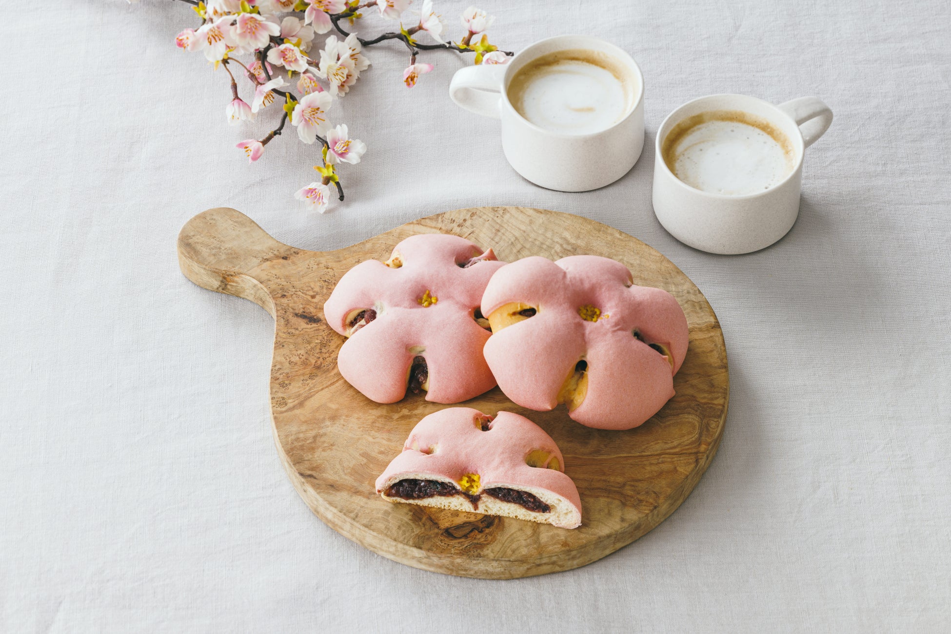 ほんのり桜香るパン生地・桜もち風フィリング・桜葉ミンチ入りのつぶ餡・桜風味のビスケット生地で、桜の味わいを楽しめる“桜の花”をイメージしたパンに仕上げました。