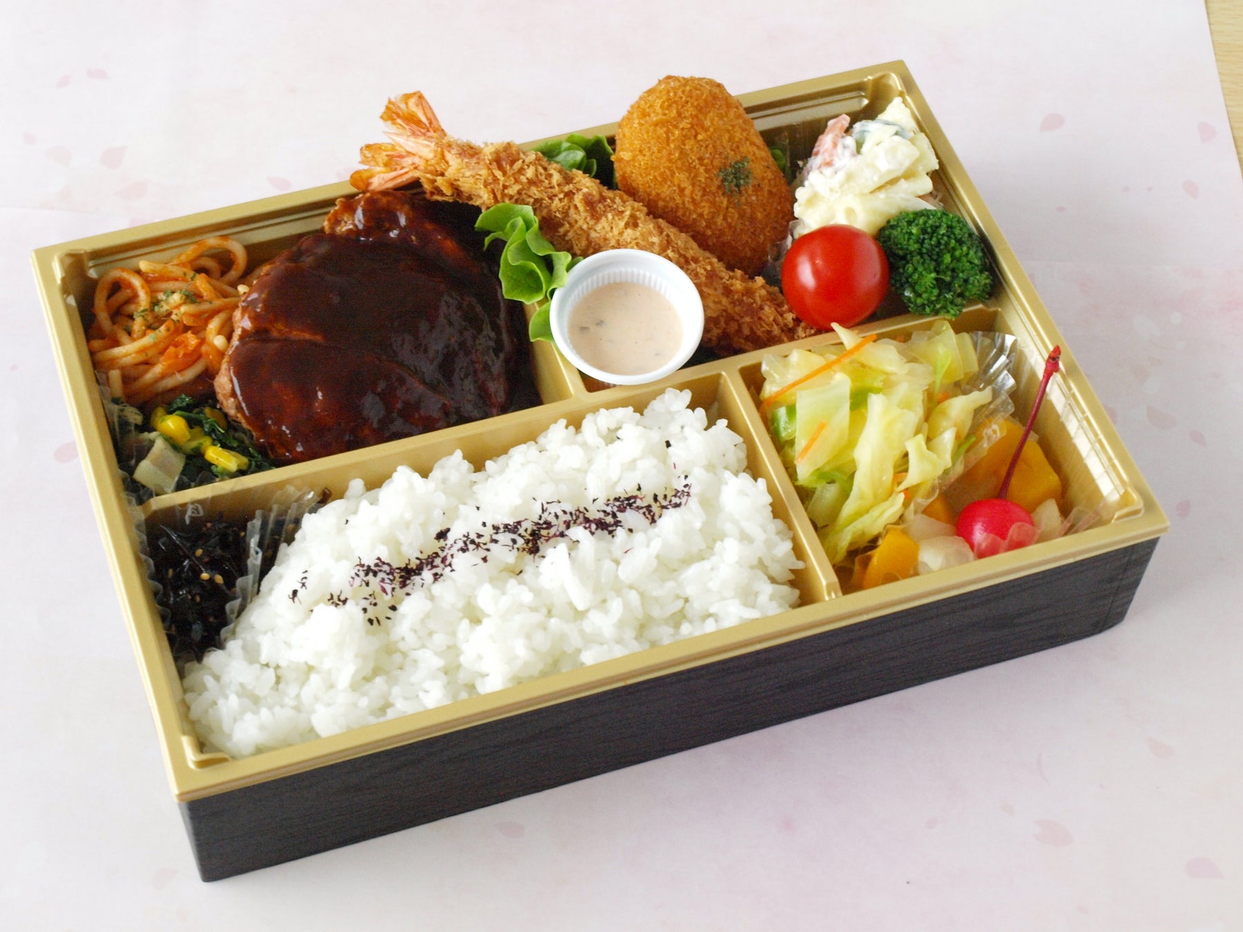 定番のハンバーグ&エビフライ、桜海老のクリーミィコロッケ、サラダなど8品のおかずを盛り込んだ春のごちそう弁当。デザートには、フルーツカクテルを添えました。