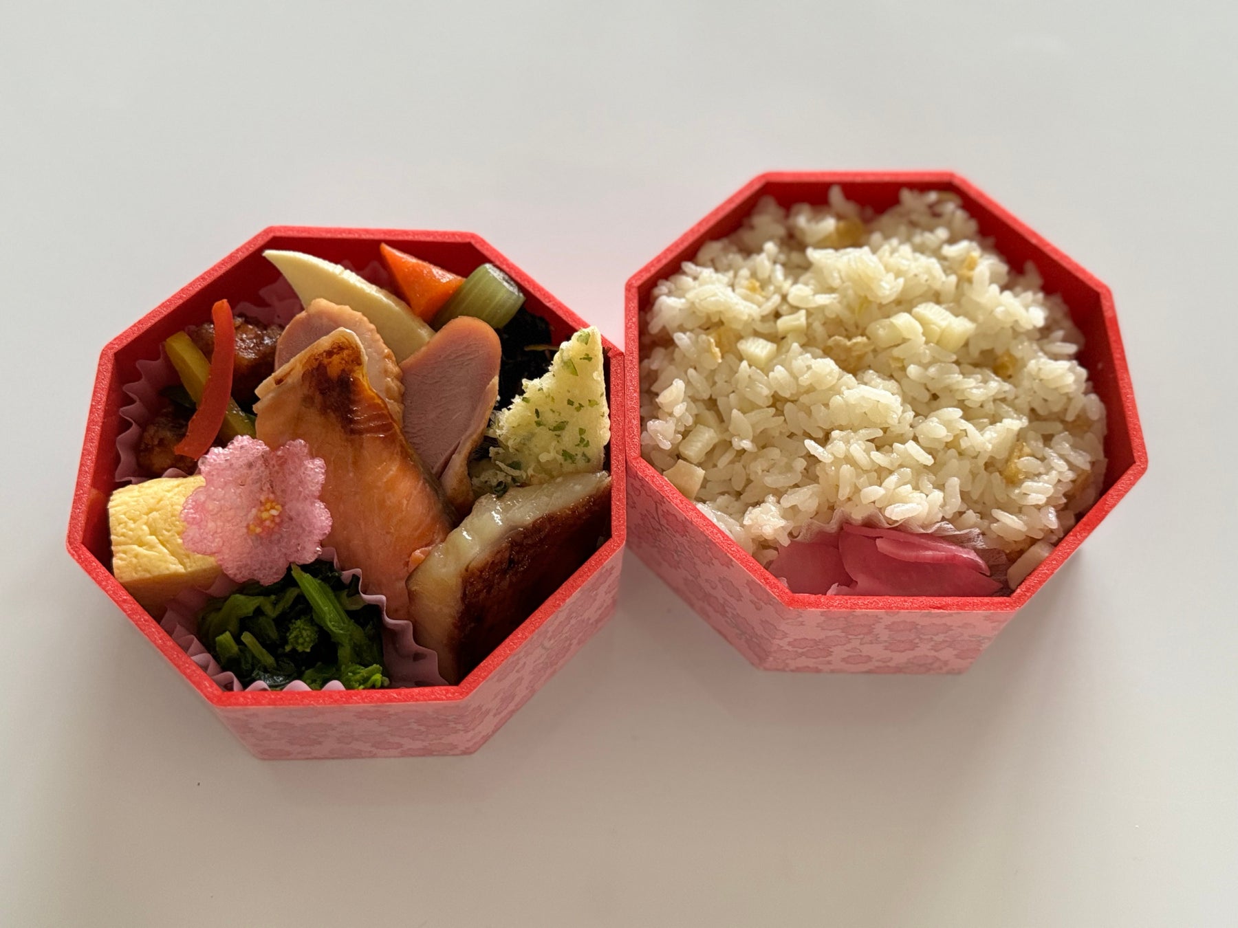 旬の魚料理と筍ご飯を盛り込んだ春らしいお弁当です。