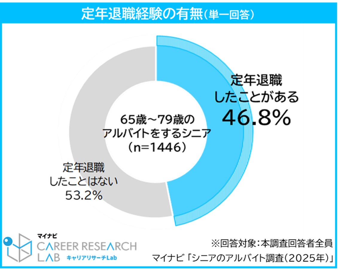 シニア層のアルバイト就業者のうち、46.8%が定年退職の経験があると回答した。