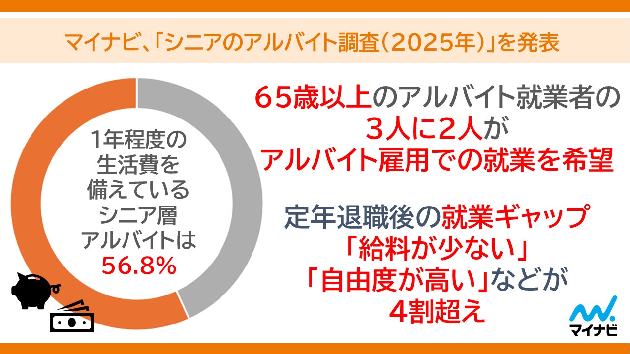 株式会社マイナビ(本社:東京都千代田区、代表取締役 社長執行役員:土屋芳明)は、65歳以上を対象とした、「シニア※のアルバイト調査(2025年)」を発表しました。