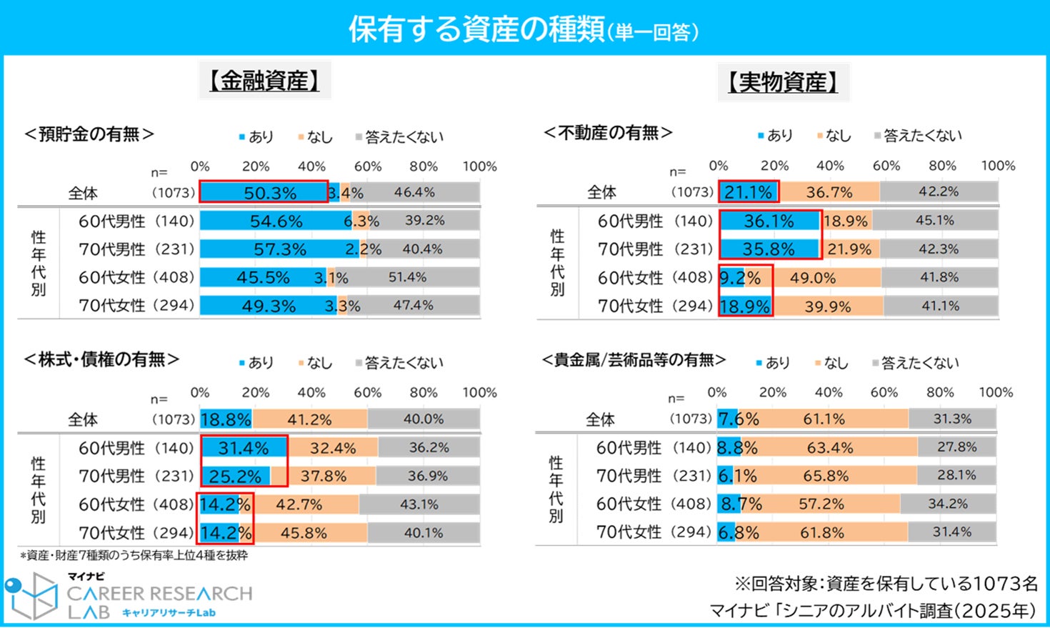 ◆1年程度の生活費を備えるシニア層のアルバイト就業者は56.8%と半数を超える。保有資産の種類は「預貯金」が最多も、男性では「不動産」「株式・債権」も高い結果に