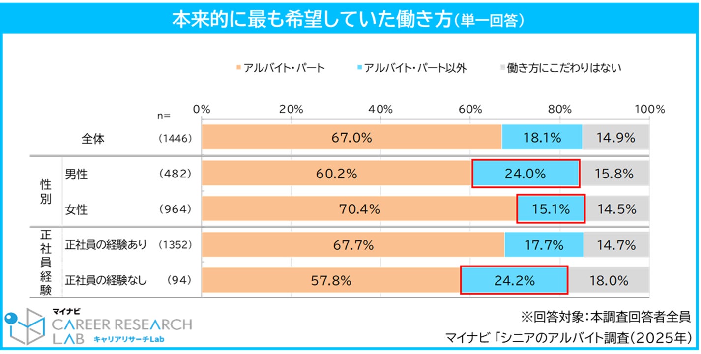 65歳以上のアルバイト就業者のうち、雇用形態において「アルバイト・パート」を本来的に最も希望していたと回答した割合は67.0%となり、3人に2人以上が、現在の就業が希望通りの働き方であることがわかった。