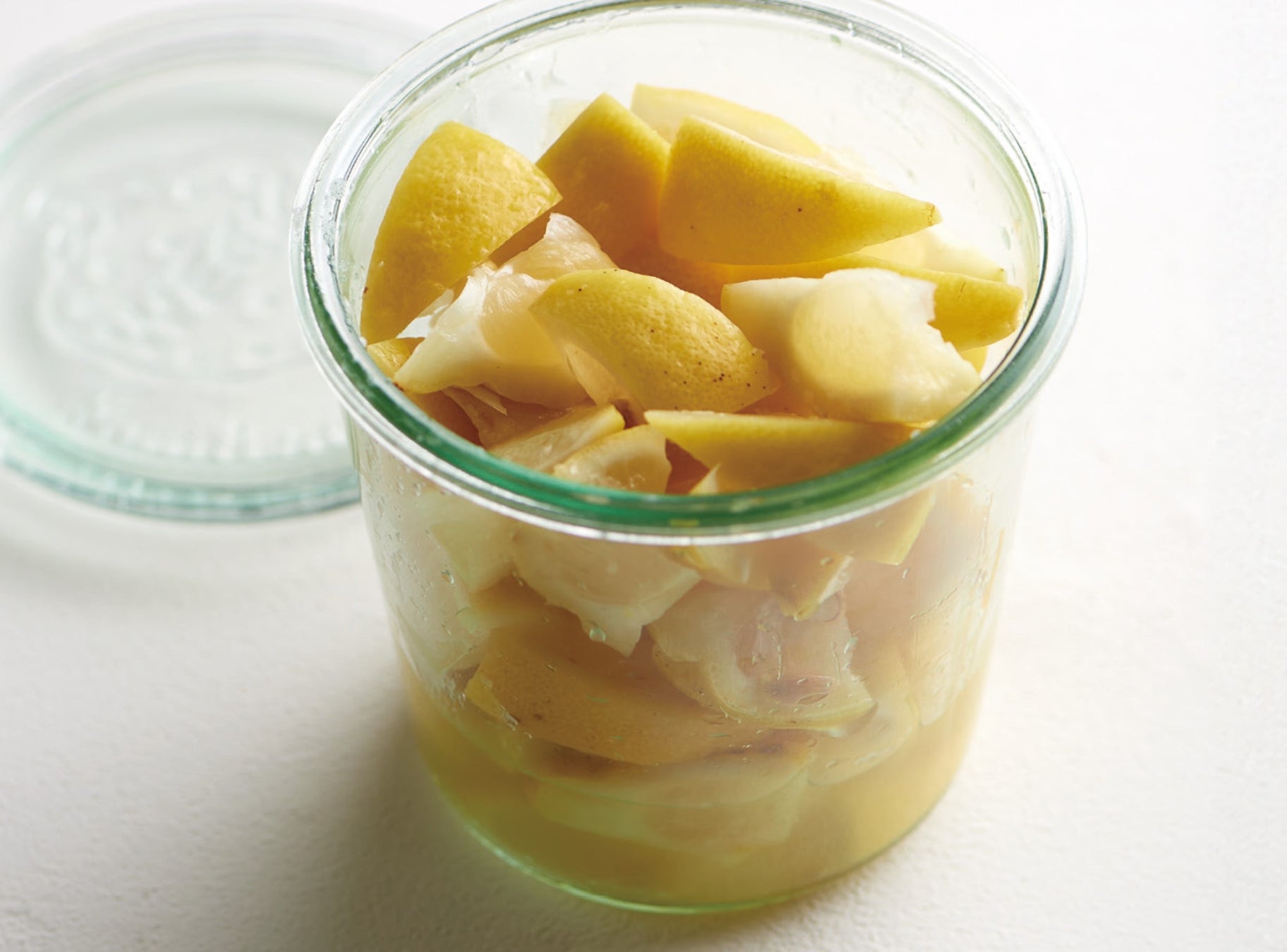 ④直射日光の当たらない涼しい場所に、常温で1週間以上おく。1日1回瓶をふり、レモンから出た果汁を全体になじませながら熟成させる(液が瓶の8分目くらいまで上がらないときには、濃度20%の塩水を瓶の8分目くらいまで加える)。レモン液がとろりとしてきたら完成。冷蔵庫に入れる。