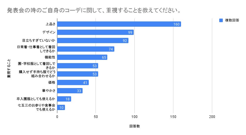 七五三や発表会を中心に"ハレの日"が続く秋、ママたちはいつも以上に服装に気を遣うようです。今回のアンケート結果では、そんな"ハレの日"に、母親としてコーディネートで重視する点に関して以下の傾向が見られました。
