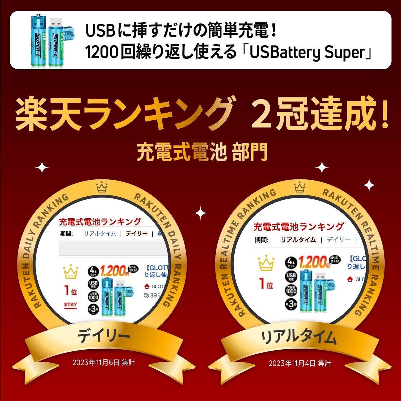 当社 株式会社Gloture(グローチャー)は近未来のライフスタイルを提案するショップ「Gloture 楽天ストア」を運営しております。 この度、USB端子を備え繰り返し充電が可能な、画期的なスーパー単3電池「USBattery Super」が楽天市場ランキングにて2冠を達成しました事をお知らせします。 カテゴリー:充電式電池部門 期間:デイリー1位 集計日:2023年11月6日(月) 2023年11月7日(火)更新 期間:リアルタイム1位 2023年11月4日(土) 22:22更新 |