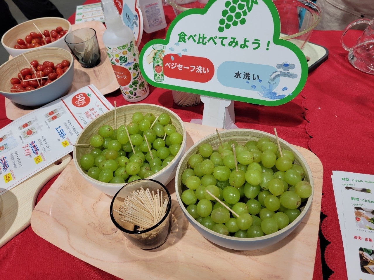 ベジセーフとお水で洗ったミニトマトやブドウを食べ比べて、食材本来の味を体感いただけます。