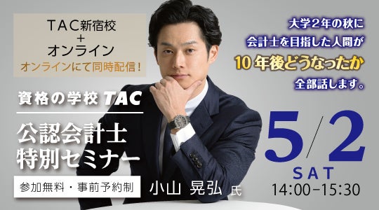 【学生対象】5/2(土)14:00~YouTuber会計士としておなじみ小山晃弘氏が登壇!大学2年で会計士を目指した私の10年後、ちょっと覗いてみませんか?【公認会計士・無料セミナー】