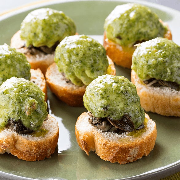 ブイヨンと白ワインで湯がき、バター、にんにく、スパイスなどを混ぜて殻に詰め冷凍。200度に熱したオーブンで約10分焼くだけで本格エスカルゴが楽しめます。