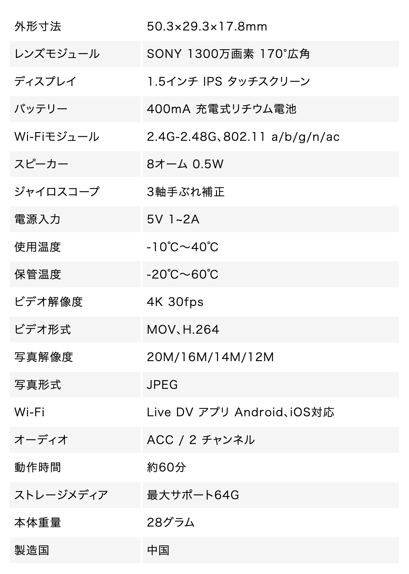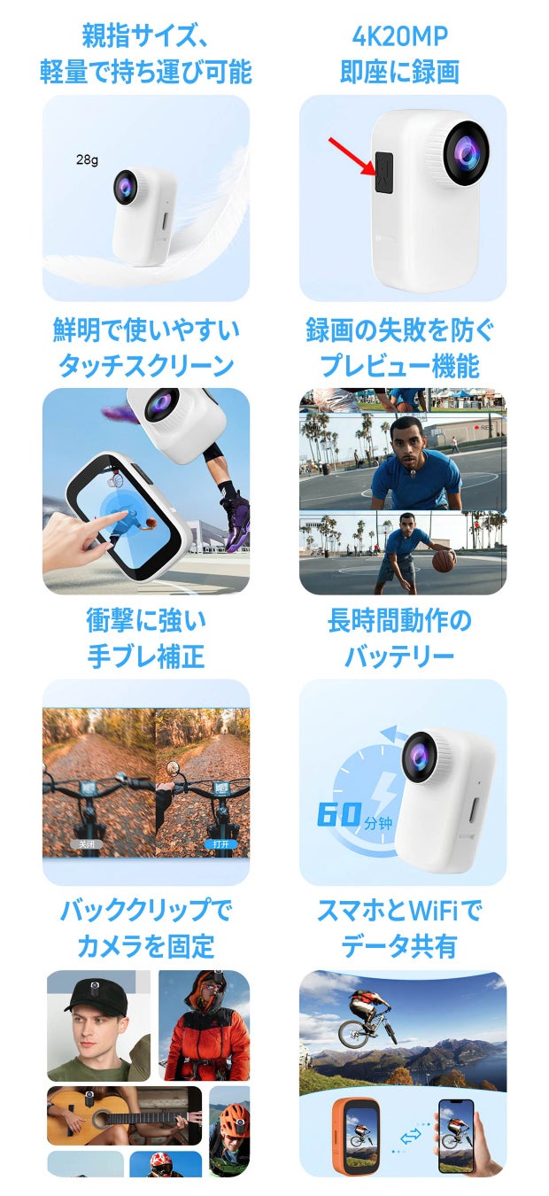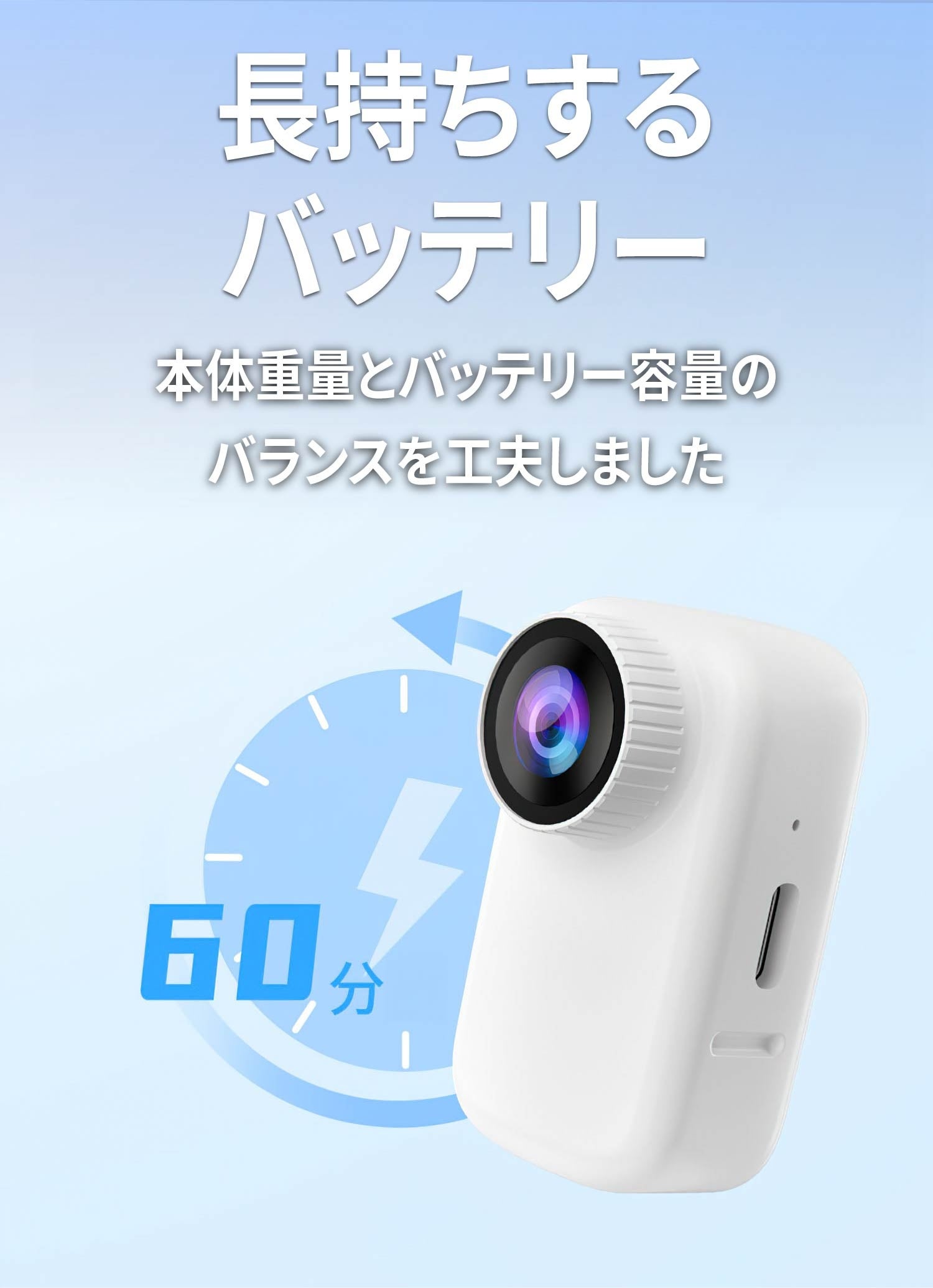28gの軽量設計を実現しながら、1回のフル充電で最長 60 分間の撮影が可能です。