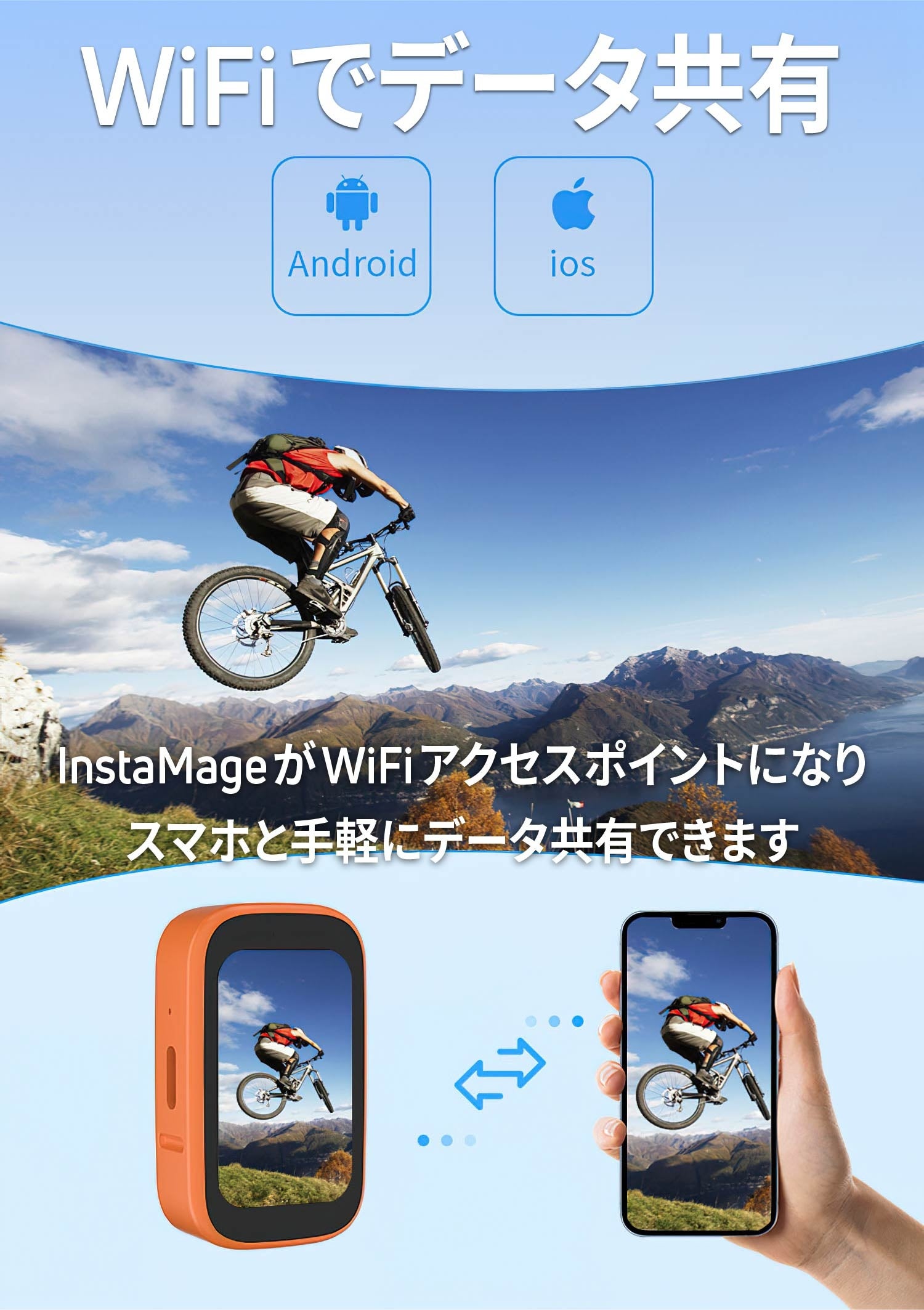 InstaMage自体がWiFiアクセスポイントとして機能し、スマートフォンと簡単にデータ共有。