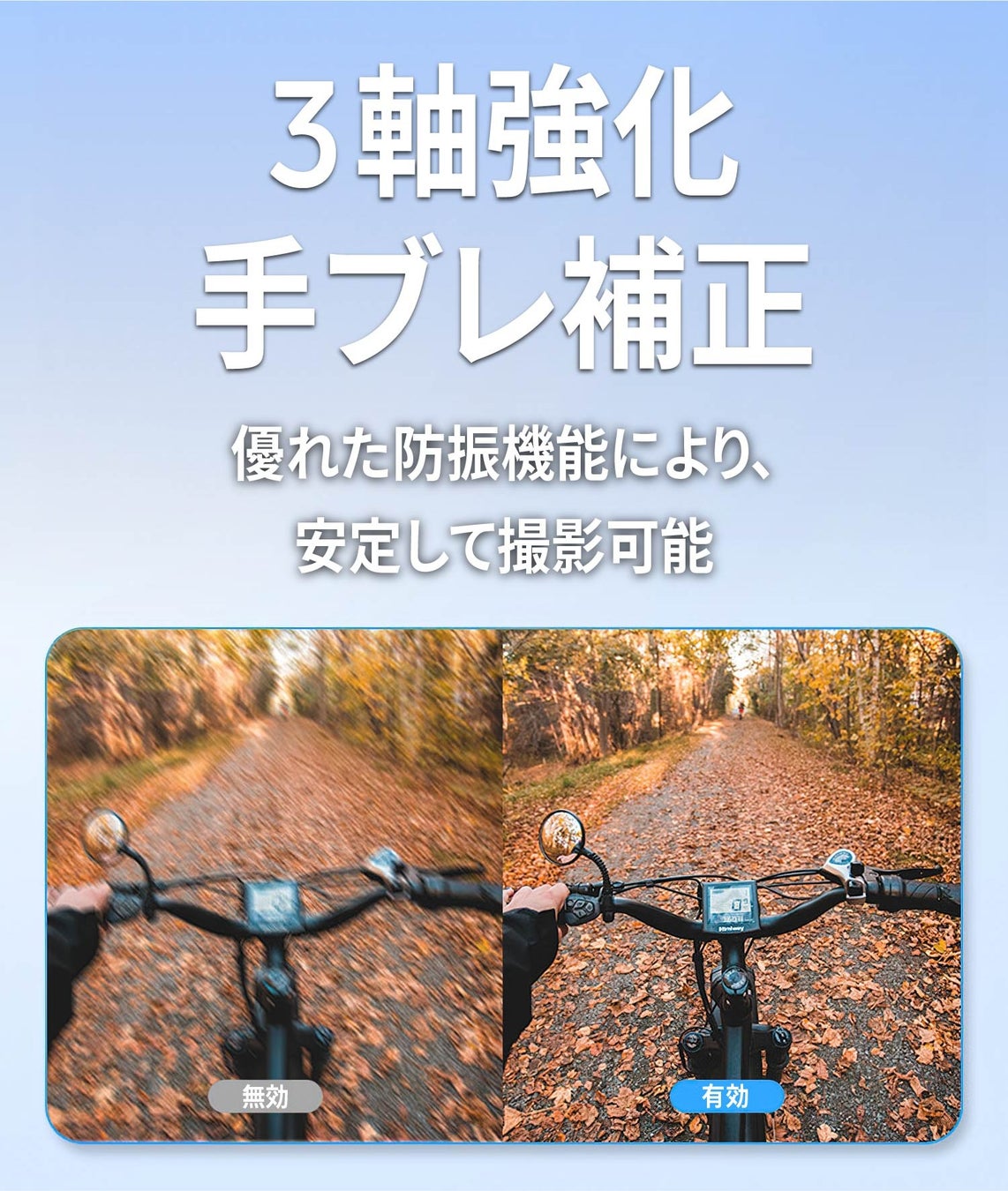 また、強力な3軸手ぶれ補正で悪路を走行しながらの撮影も対応。