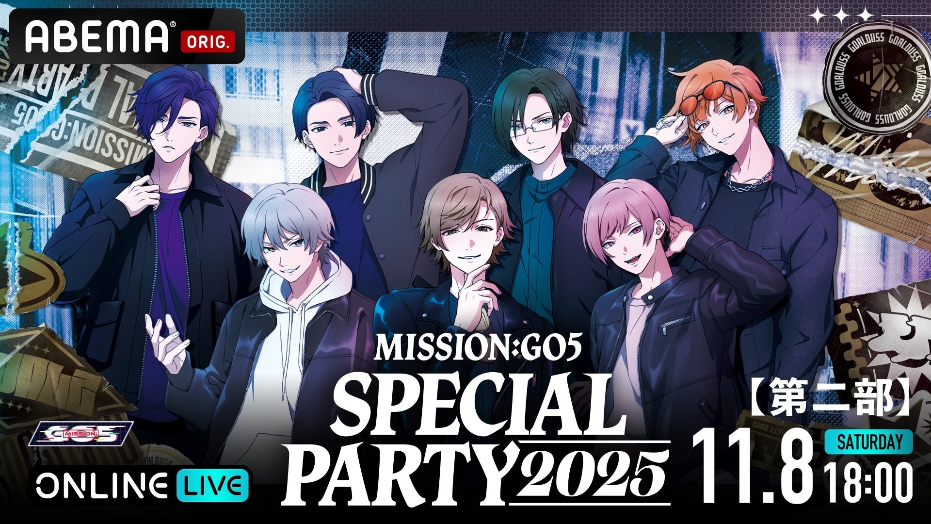 このたび「ABEMA PPV」で独占生放送が決定した、『MISSION:GO5 SPECIAL PARTY 2025』は、2025年11月8日(土)に開催される「GOALOUS5」の2次元キャラクター化プロジェクト「MISSION:GO5」をメインとしたファンイベントです。「MISSION:GO5」約2年ぶりの開催となる本イベントには、「GOALOUS5」のメンバー5名にくわえ、ゲストとしてライバルグループ「RIVALZ」の燈 灯夜 役・狩野 翔、藤崎紫狼 役・濱野大輝も出演。朗読から歌唱、バラエティ企画まで、盛りだくさんなコンテンツが予定されています。