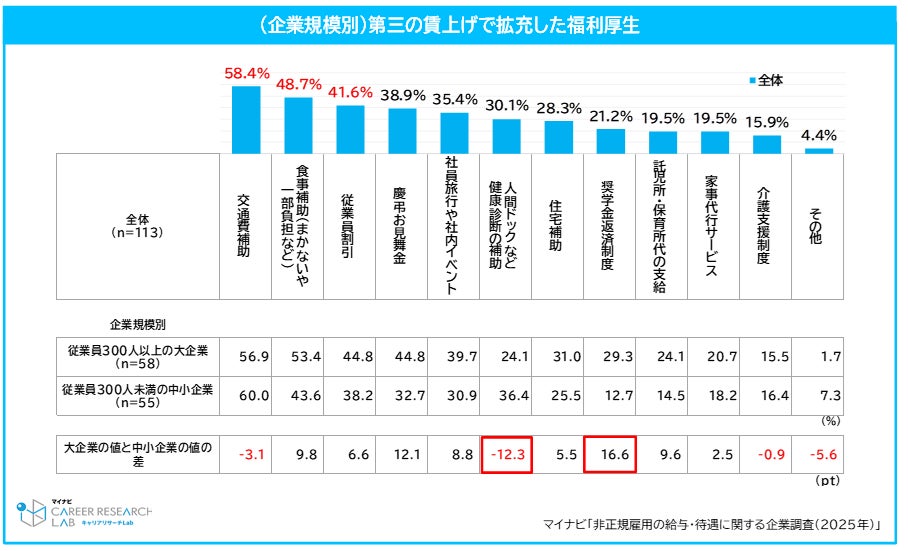 「第三の賃上げ」として実施された福利厚生の内容では、「交通費補助」が58.4%で最も多く、「食事補助(48.7%)」、「従業員割引(41.6%)」が続いた。大企業では「奨学金返済制度」が中小企業に比べて16.6pt高く、逆に中小企業では「人間ドックなど健康診断の補助」が12.3pt高かった。【図3、4】
