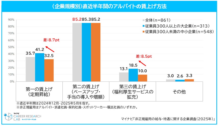 直近半年間において、アルバイトの賃上げをした企業のうち、「第一の賃上げ※2」を行った企業は35.7%、「第二の賃上げ※3」を行った企業は85.2%、「第三の賃上げ※4」を行った企業は13.1%と、「第二の賃上げ」を行った企業が最も多かった。また、近年注目されている「第三の賃上げ」に関しても、10社に1社以上が実施していた。