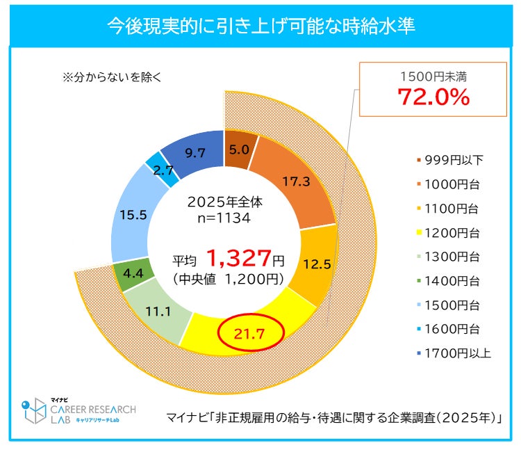 さらに、今後現実的に引き上げが可能と考える時給水準は「1200円台」が21.7%で最多となり、平均的な引き上げ可能額としては1327円となった。一方で、「1500円未満」と回答した企業は全体の約7割(72.0%)となり、企業側の賃上げに対する上限意識も垣間見える。【図5、6、7】