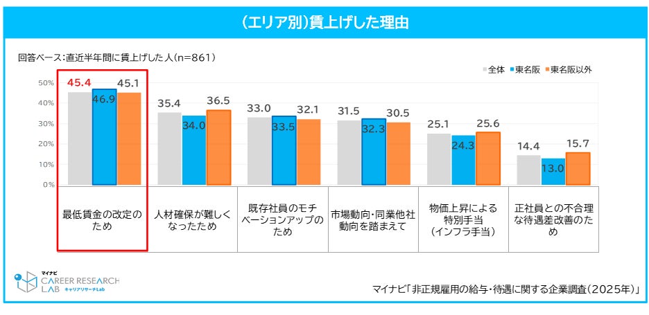 賃上げの理由としては、「最低賃金の改定のため」が45.4%で最も多く、制度改定に伴う最低賃金の引き上げが、企業の対応に影響している。【図1、2】