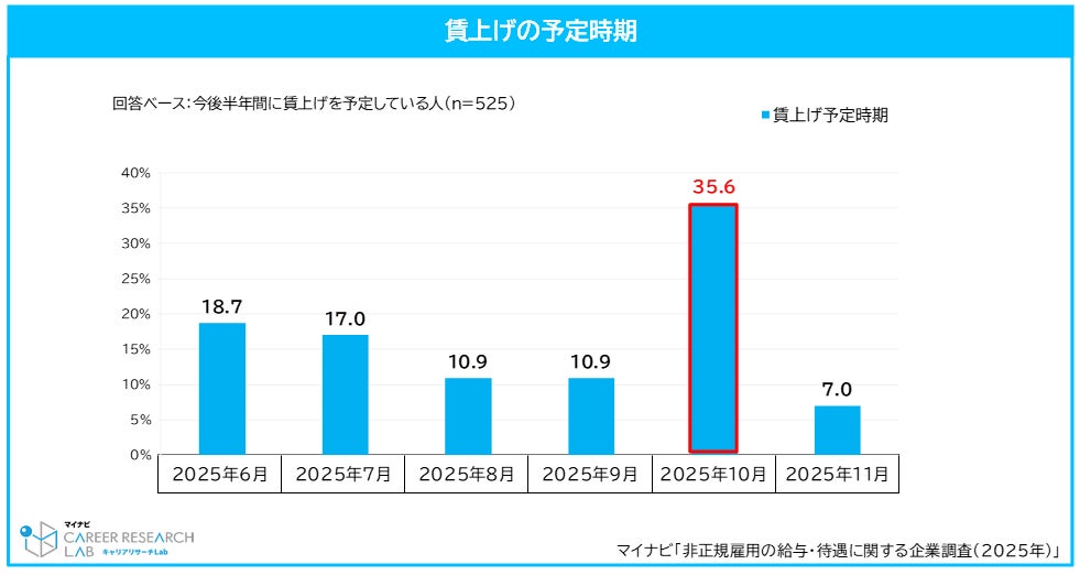 賃上げ予定企業に対して、いつ頃賃上げするかを聞いたところ、「2025年10月」が35.6%で最も高かった。