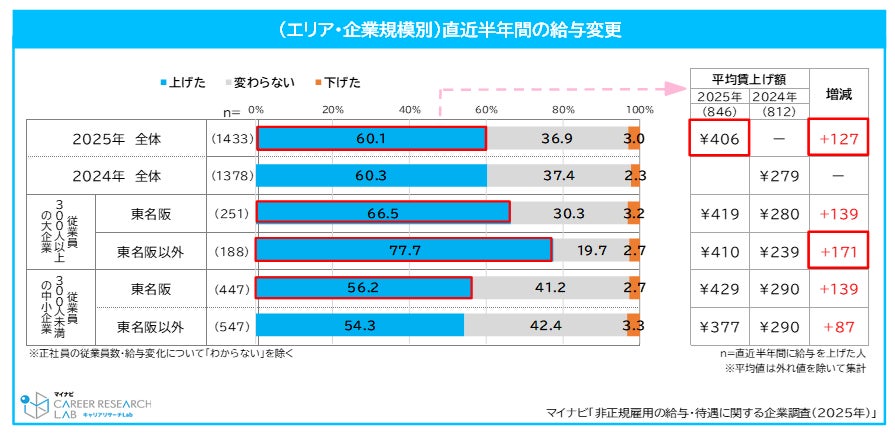 平均賃上げ額は、全体平均406円で、前年(279円)から127円と大幅に増加した。エリア・従業員規模別では、「東名阪以外の大企業」が増加額171円(2025年:410円、2024年:239円)と、最も増加した。