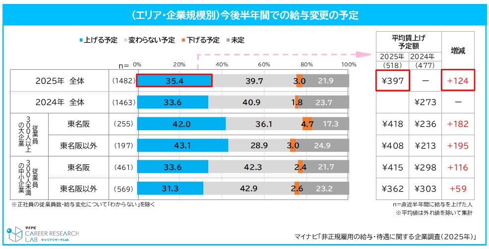 特に「東名阪以外の大企業」では7割以上が賃上げを実施しており、平均賃上げ額も大幅に増加しています。さらに今後の予定についても、最も高い実施意向を示しており、今年の賃上げは東名阪以外のエリアについても一層進展することが期待できます。