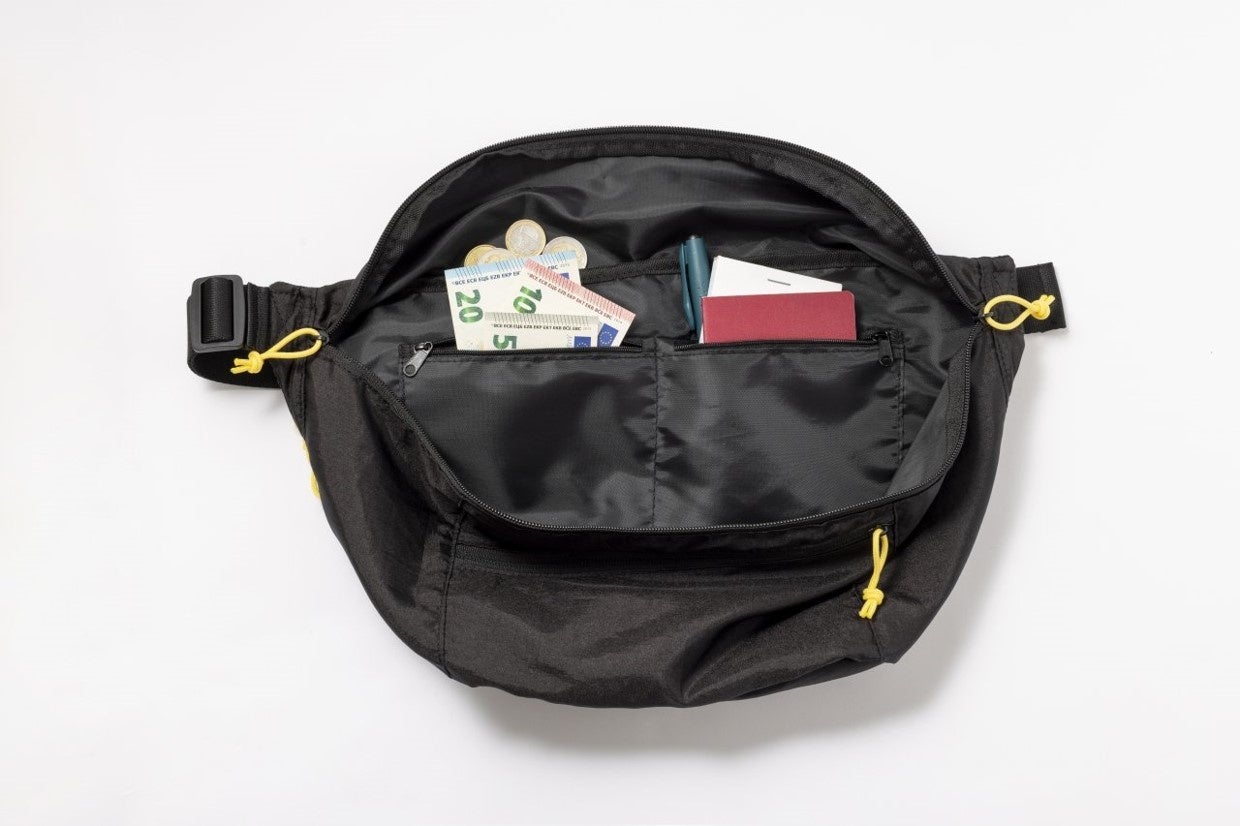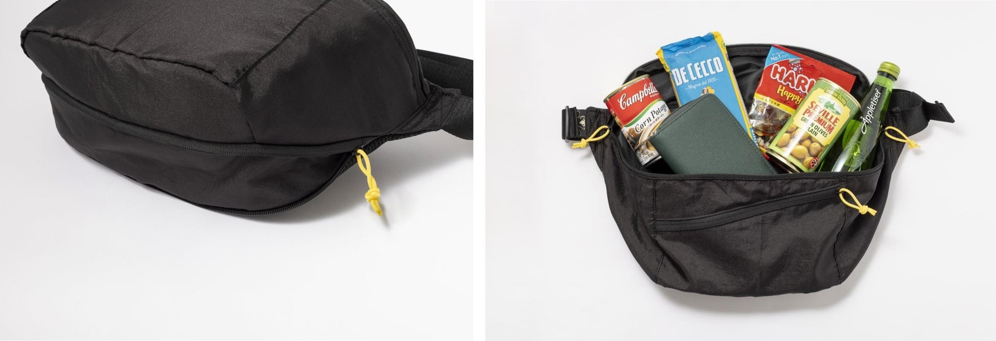特別アイテムは、「21世紀にもなって、手でカバン持つのとか効率悪くない?」というポストが話題となったひろゆきさんが監修したウエストポーチ。ウエストポーチ愛用歴20年のひろゆきさんの「パラシュートの生地を使った軽くて丈夫なウエストポーチを作りたい」という希望のもと、商品化が実現しました。軽くて耐久性のあるパラシュート生地で、重い荷物も安心して入れられるのに重量はたったの約150g。収納量をアップすることができる拡張機能つきだから、急に荷物が増えたときにも安心です。