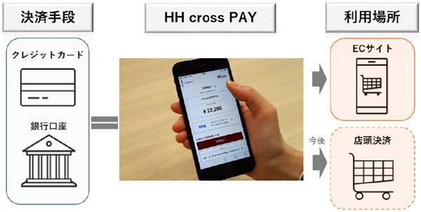 「HH cross PAY」は、お客様が登録した「HH cross ID」と、お持ちのクレジットカードや銀行口座を紐づけることにより、同IDを導入しているサービスのご利用時に、そのお支払いの都度、クレジットカード情報などを入力する手間なく、スムーズにお会計することができるペイメントサービス※1です。