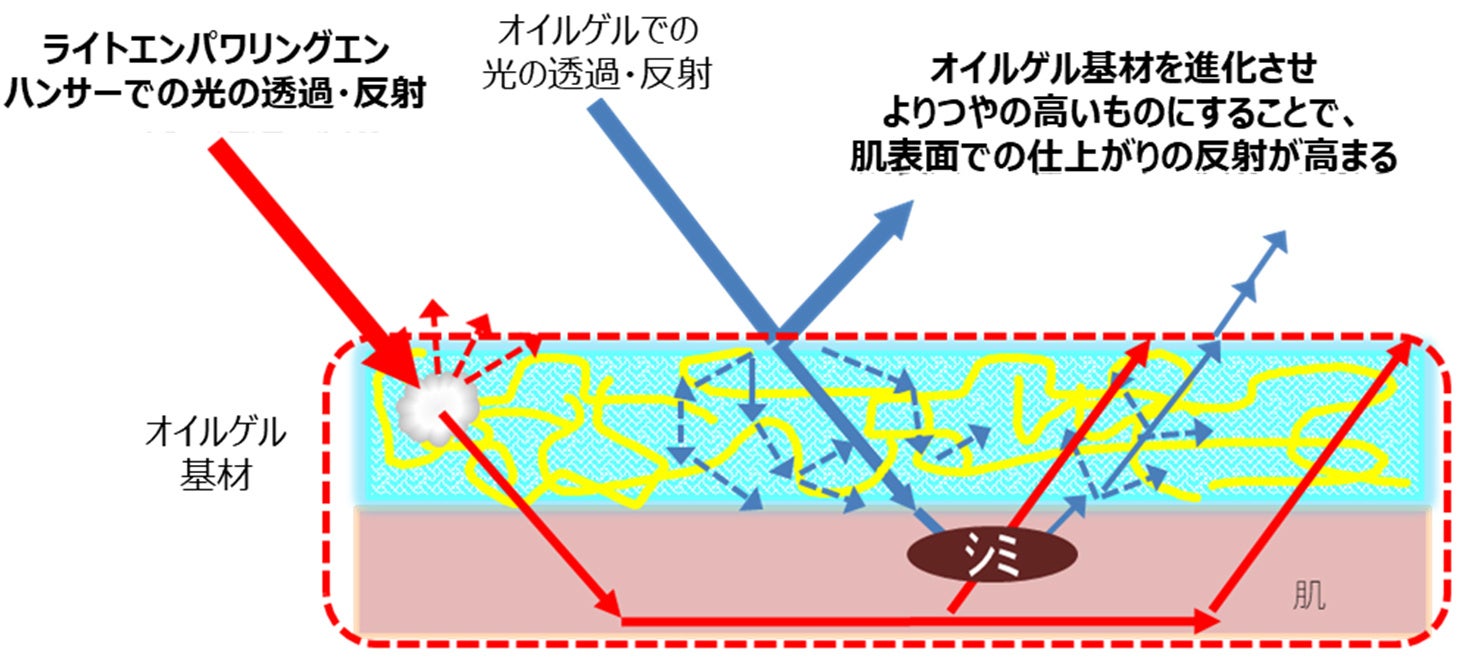 肌に光を取り込み、肌悩みをカバーし美しく演出する“ライトエンパワリングエンハンサー”と新しいオイルゲルの効果が光の透過を高め、半透明のオイルゲル基剤の中を光がランダムに広がることにより“ぼかし効果”と“うるおいのあるつや“の両立を実現します。