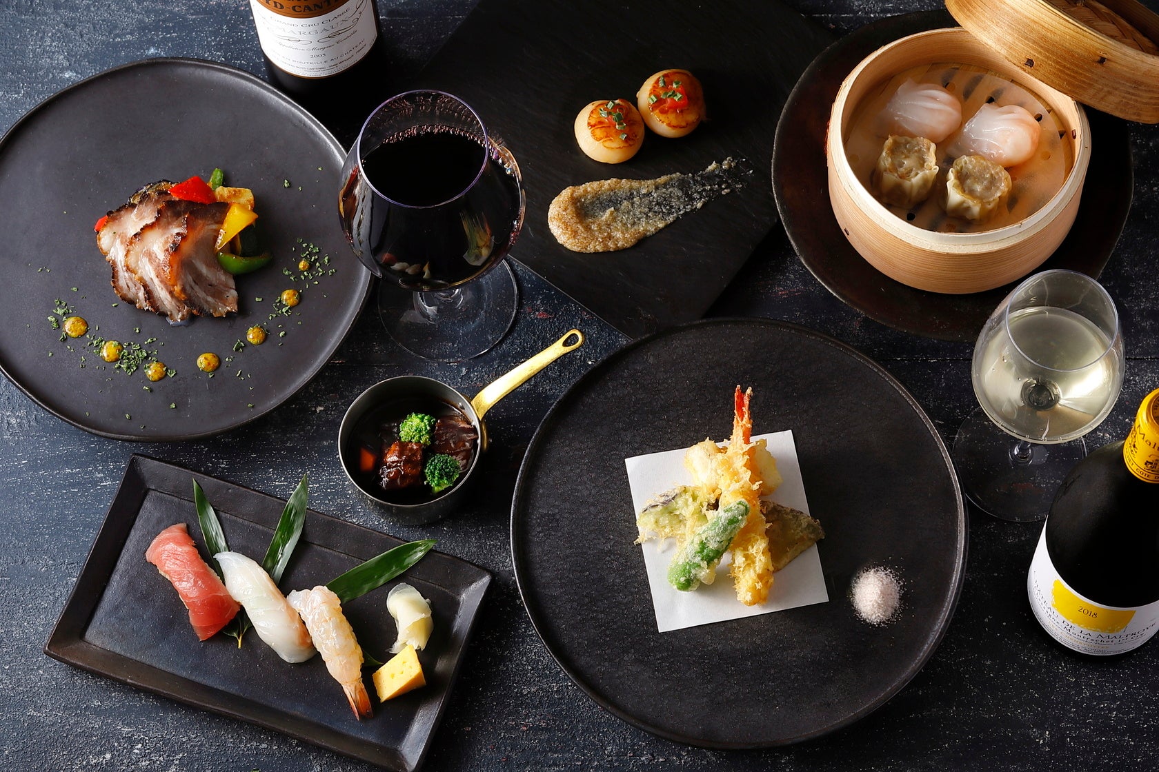 「VIEW & DINING THE SKY」で人気の料理の中から、和洋中・鉄板焼きのおすすめの逸品を、各ジャンル別に盛りつけたプレート『the PLATE』が登場。寿司、天ぷら(日本料理)、ビーフシチューやアクアパッツァなどの西洋料理、サーロインステーキや帆立の鉄板焼き、更には中国料理まで出来立てをご提供します。気分にあわせてチョイスしてお愉しみください。