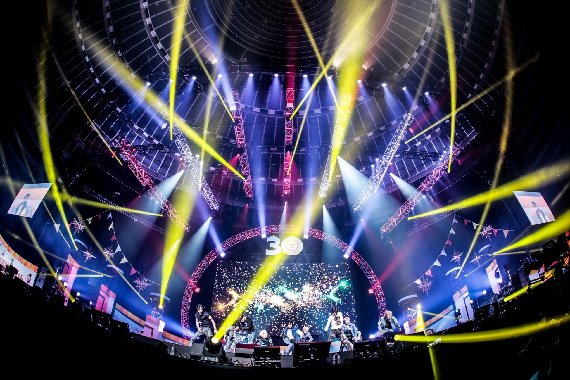 その後、INIのロゴが大きく映像に映り暗転すると、メンバー11人でINIとしてステージに登場し、ストリーミング累計再生回数1億回超えの「CALL 119」を披露。メンバーの姿が見えた瞬間、客席からは大きな歓声があがった。3曲目の「BOMBARDA」ではイントロで西洸人が「30周年おめでとうございます!皆さんまだまだ盛り上がれますか!」と叫ぶと、会場のボルテージはますます上がっていった。声出しOKのライブということもあり「We are “I.N.I”」と多くのMINIの合唱が響き渡った。4曲目の「BAD BOYZ」でも勢いは止まらず、圧巻のダンスパフォーマンスにペンライトが大きく揺れた。