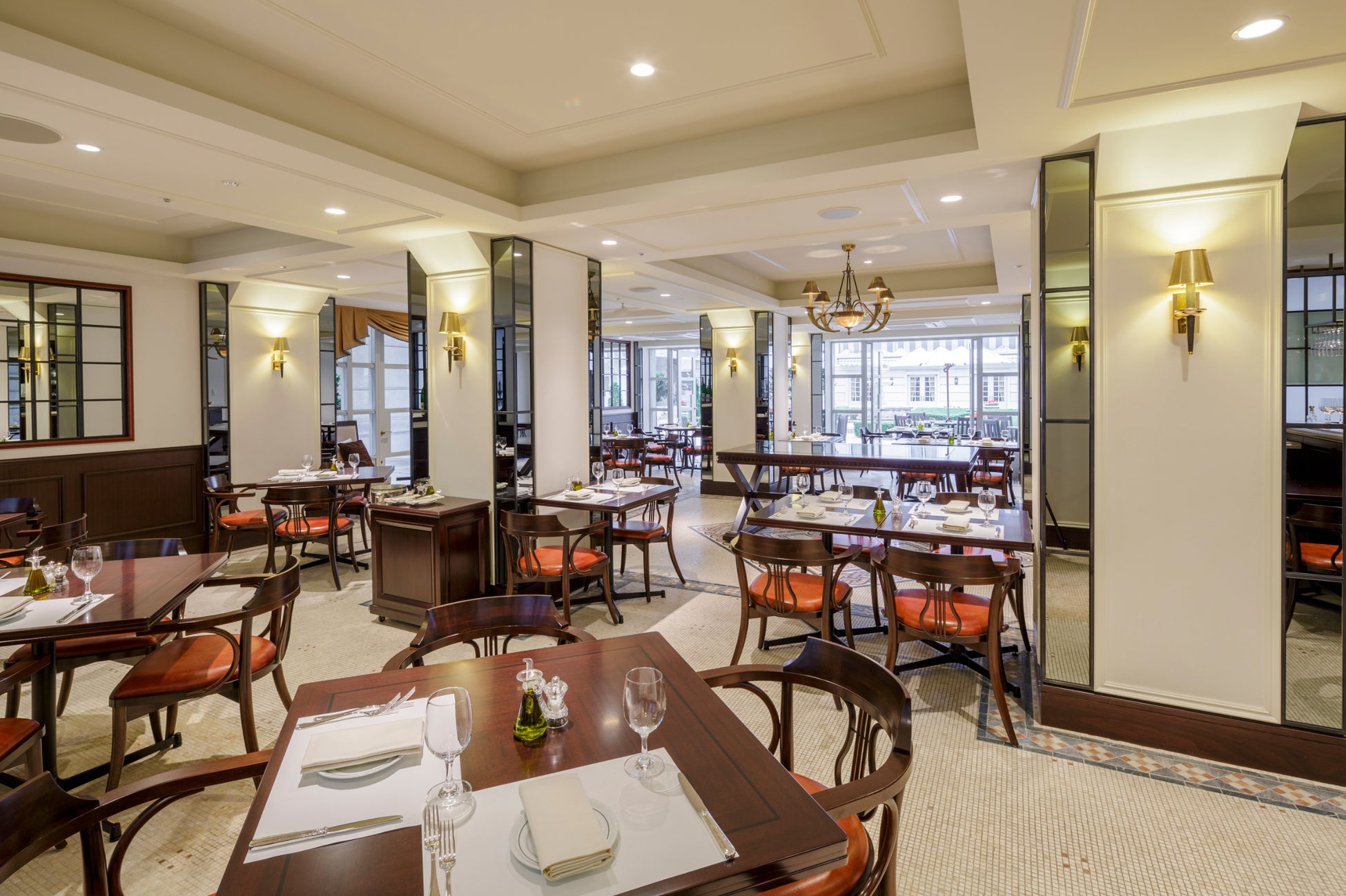 実在したフランスの豪華客船ノルマンディー号をコンセプトにした店内からは横浜港の景色を一望いただけます。青い海と空を一望することができる店内からは、景色に包まれているかのような優雅なお食事のひとときをお楽しみいただけます。