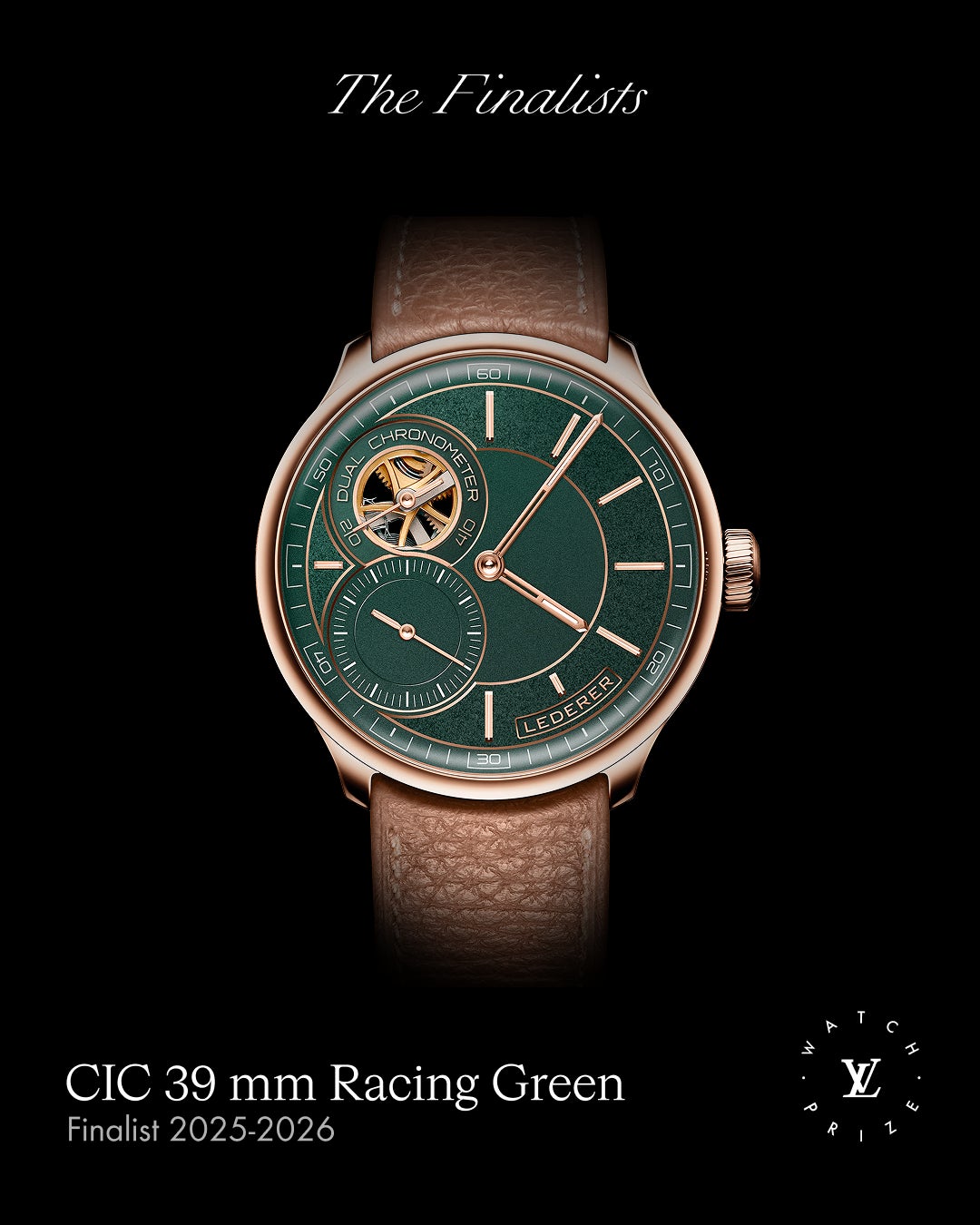 レデラーの「CIC 39 mm Racing Green」は、腕時計として初めてフル機能のデュアル·デテント脱進機を採用。ツイン脱進機を持つムーブメントとデュアル·ルモントワール デガリテを搭載して、常に一定の動力伝達を実現しています。透明なケースバック越しに見える、212個の部品で構成されたムーブメントは、二重の歯車列とコンスタントフォース機構を露わに示す一方、サンドブラスト加工を施したマット仕上げのダイアルは、特許取得済みの脱進機構や、逆進秒針付きの層状サブダイアルを強調。直径39 mmのケースは厚さ10.75 mm、COSC認定ムーブメントは98%が自社製造。